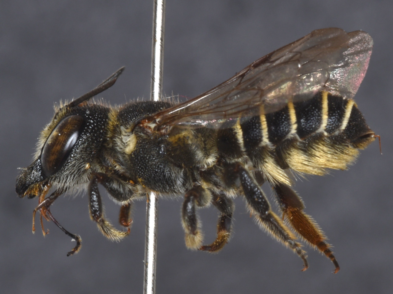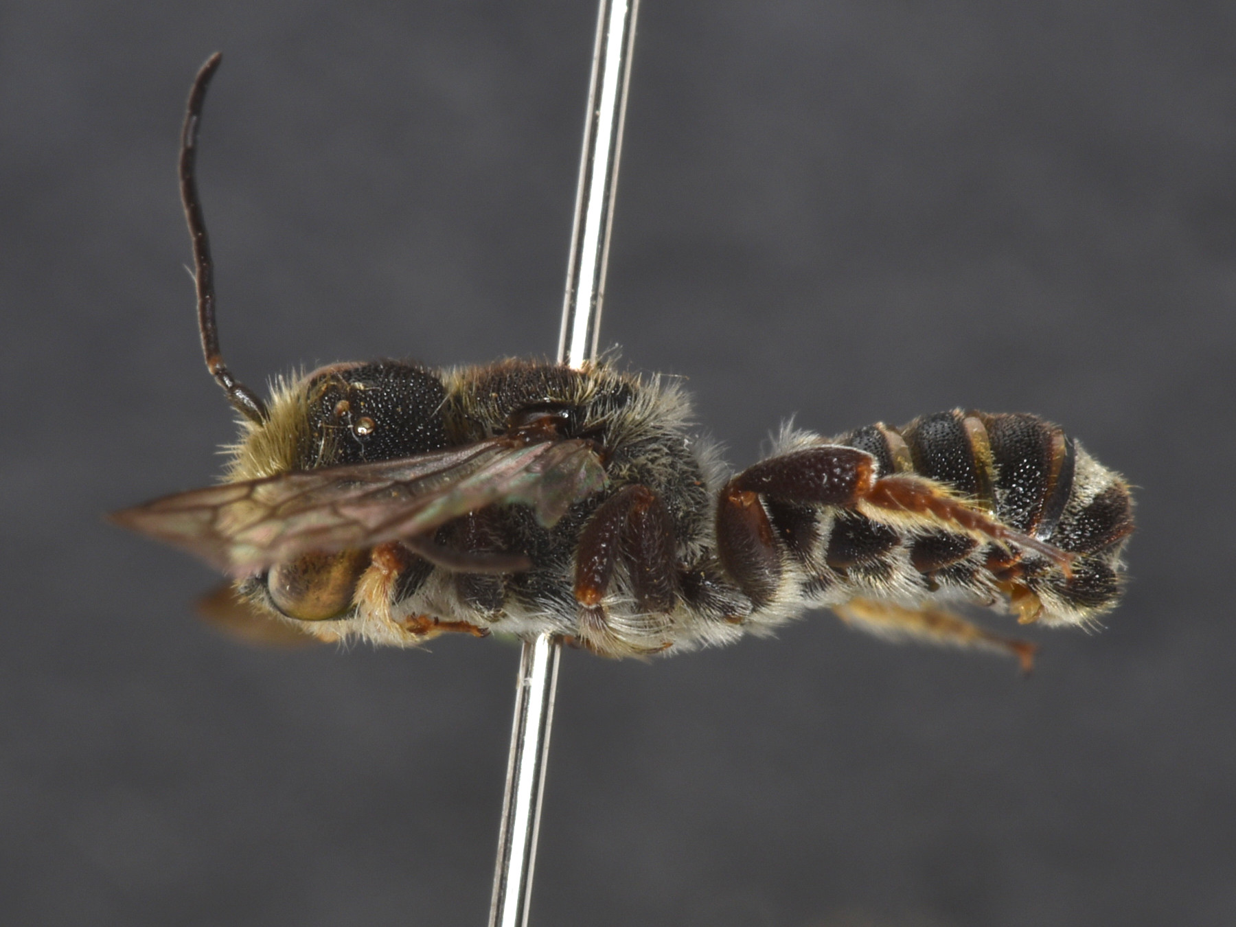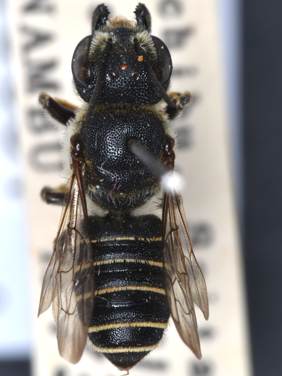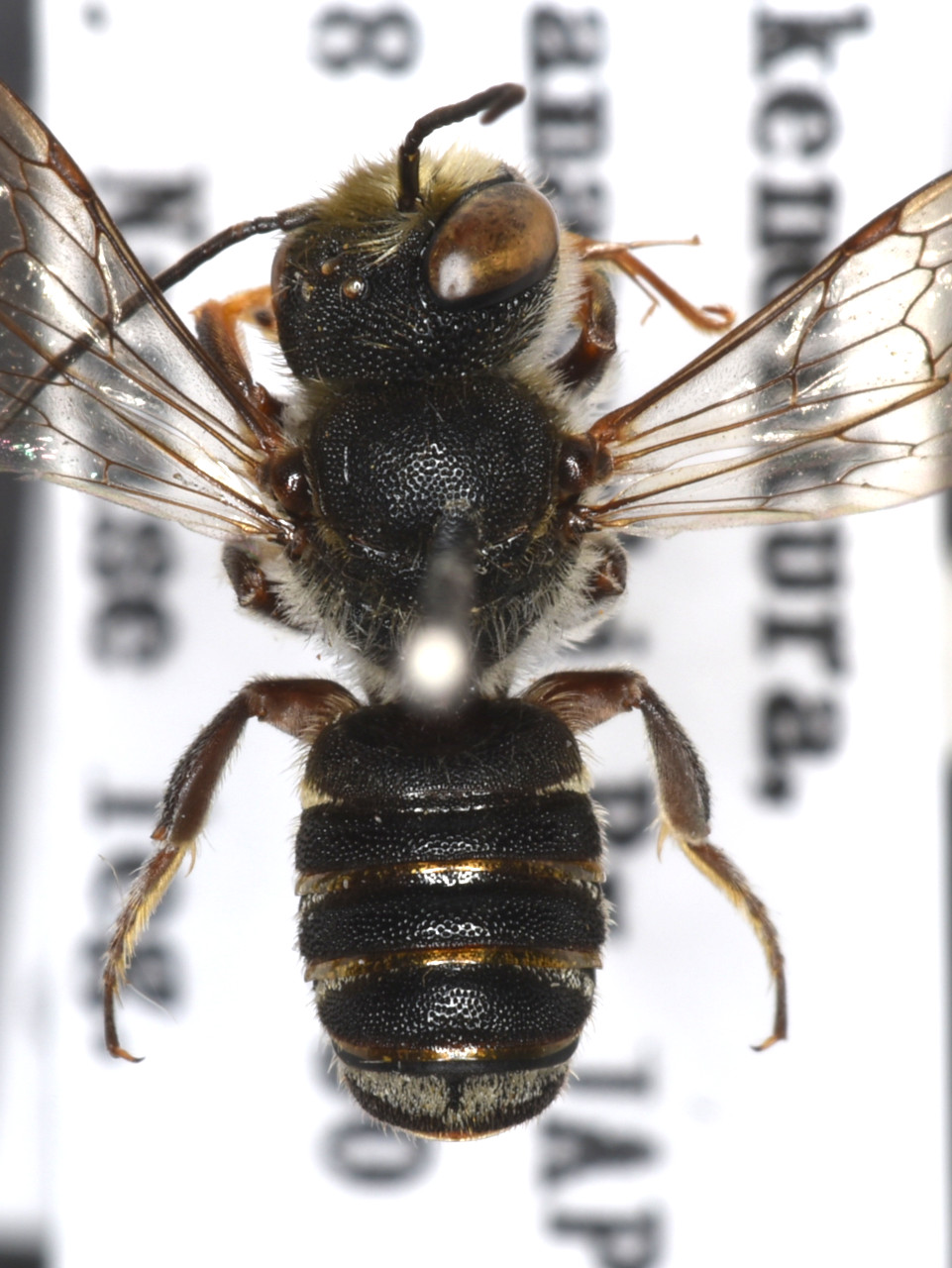 体は黒色で、毛は主に淡灰褐色。メスでは末端節以外の腹部背板後縁に、ほぼ同色の短毛帯がある。雌雄とも体の点刻が強く、腹部は厚みがありほぼ円筒形。