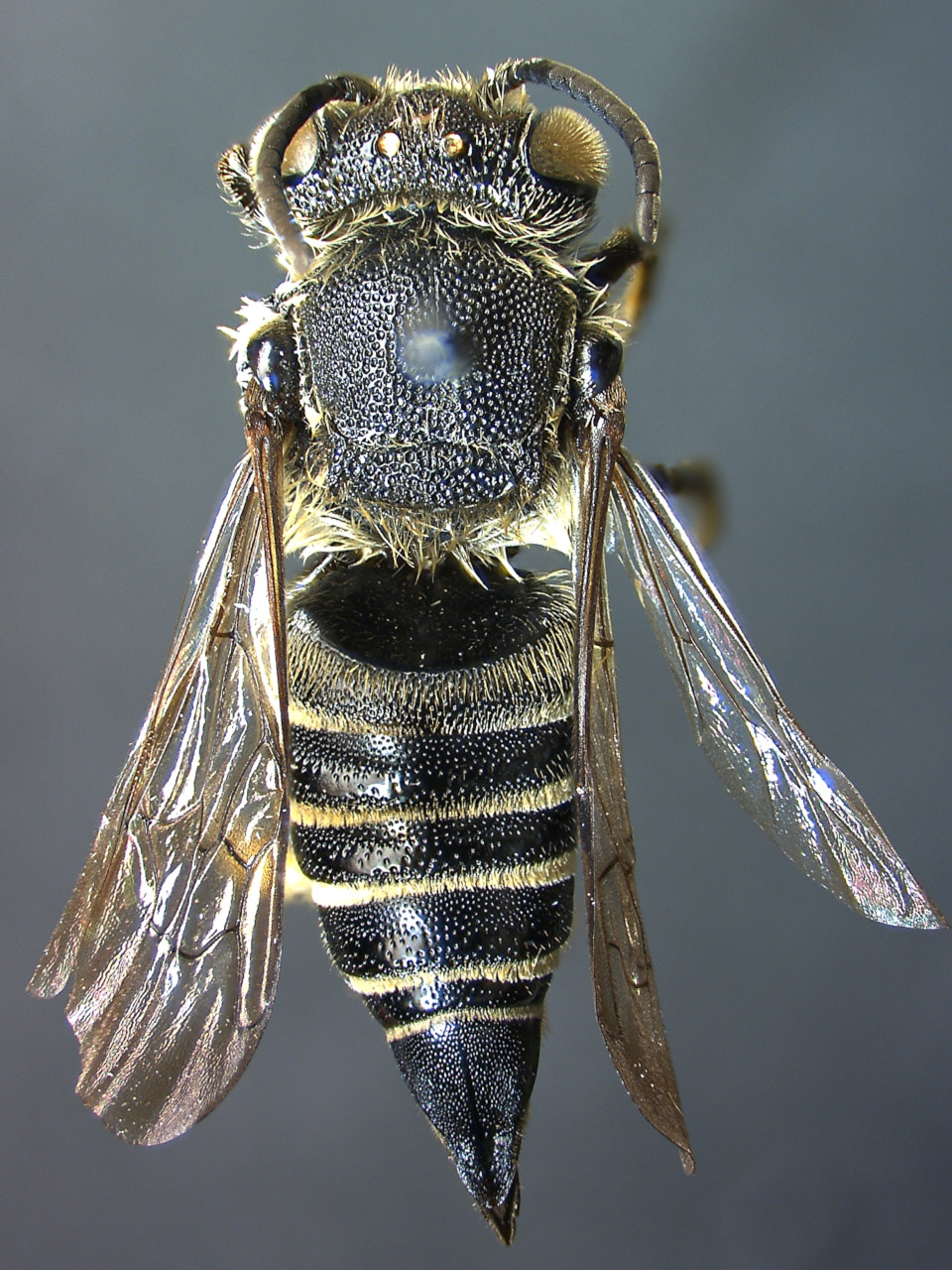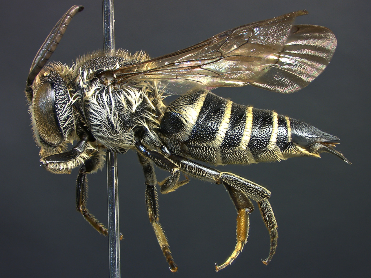 体は黒色で、毛は白色~灰褐色。腹部第1~5節の後縁に毛帯がある。メスの大顎は基部では両側がほぼ平行だが先端で急に細くなる点で、近縁のホソバトガリハナバチと異なる。ツルガハキリバチなどに労働寄生(ハラアカヤドリハキリバチの項を参照)する。