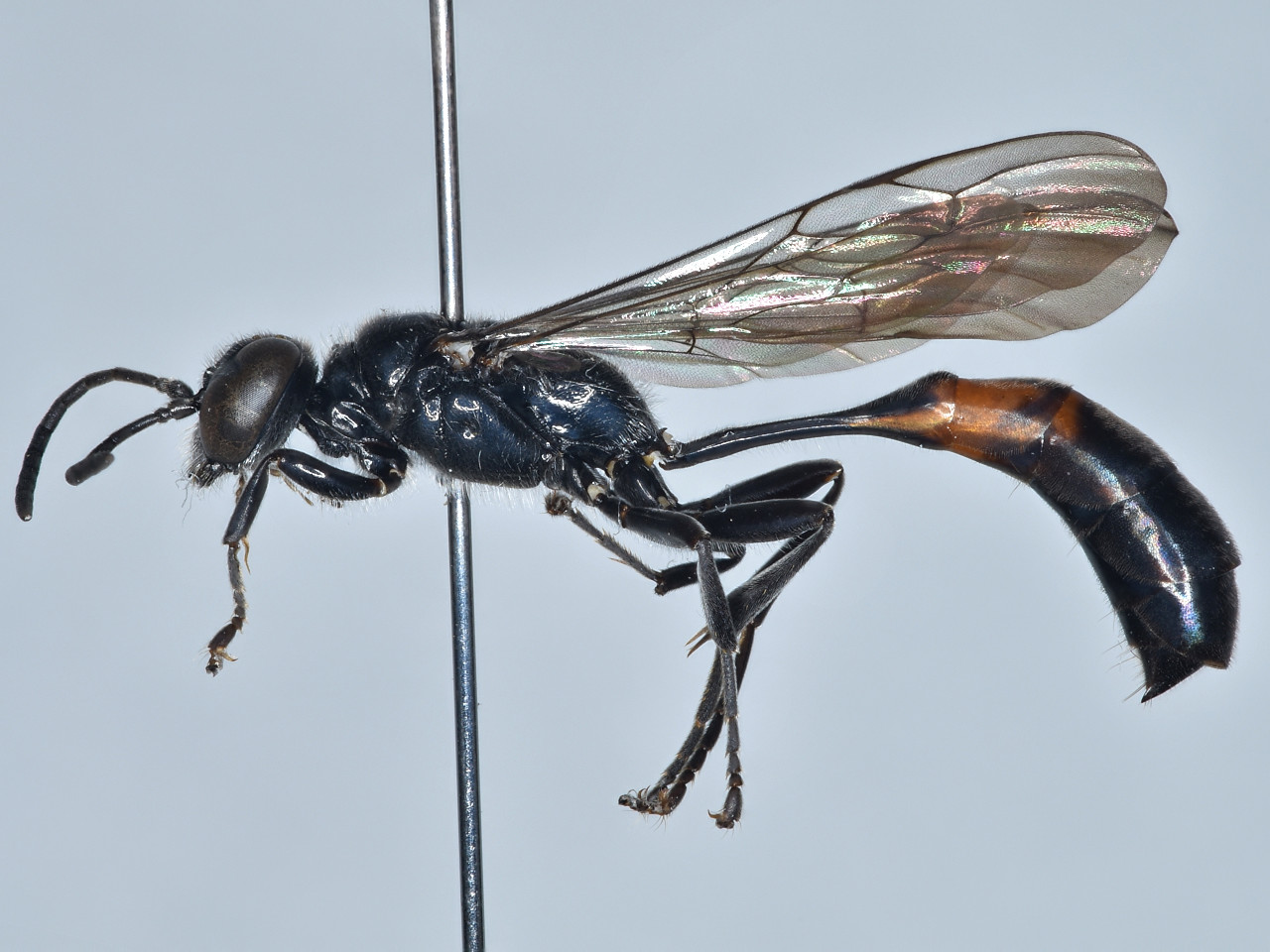 オオジガバチモドキ 腹部第1節は、基方が細く後方で急に幅が広くなるフラスコ状。メスの腹部第2、3節に赤色帯がある。日本のジガバチモドキ属の中では大型種。コガネグモ科のクモを狩る。日本に30種以上いる本属は、いずれも基本的に借孔性と考えられるが、類似種が多く同定は難しい。
