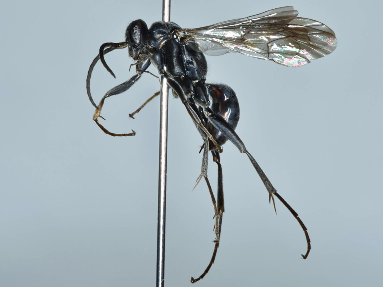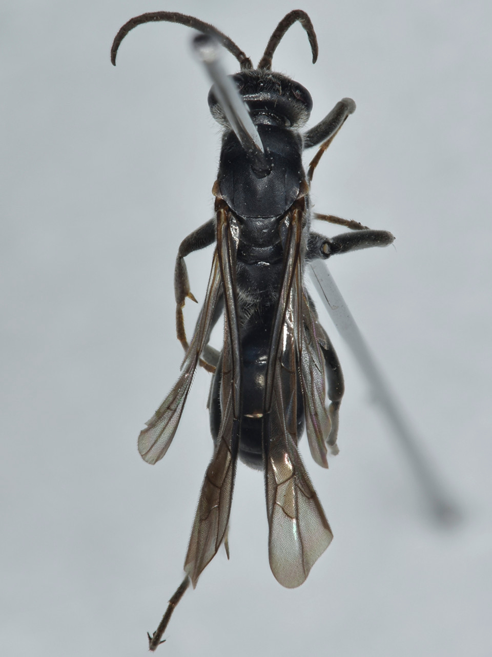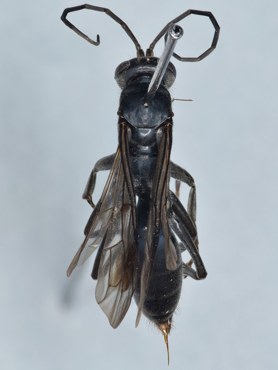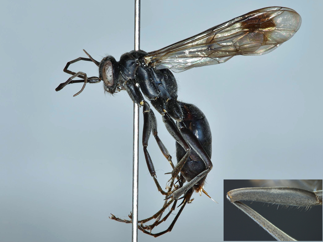体は黒色で、体全体に灰白色の微毛がある。シロオビヒゲクモバチに似ているが、メスの中・後脚腿節下面に長い立毛が多数ある。本属のメスは、小顎の付根に非常に長く湾曲したヒゲの束がある。本属には近似種が多く、主に森林性で育室内に米粒型のマユを作る。