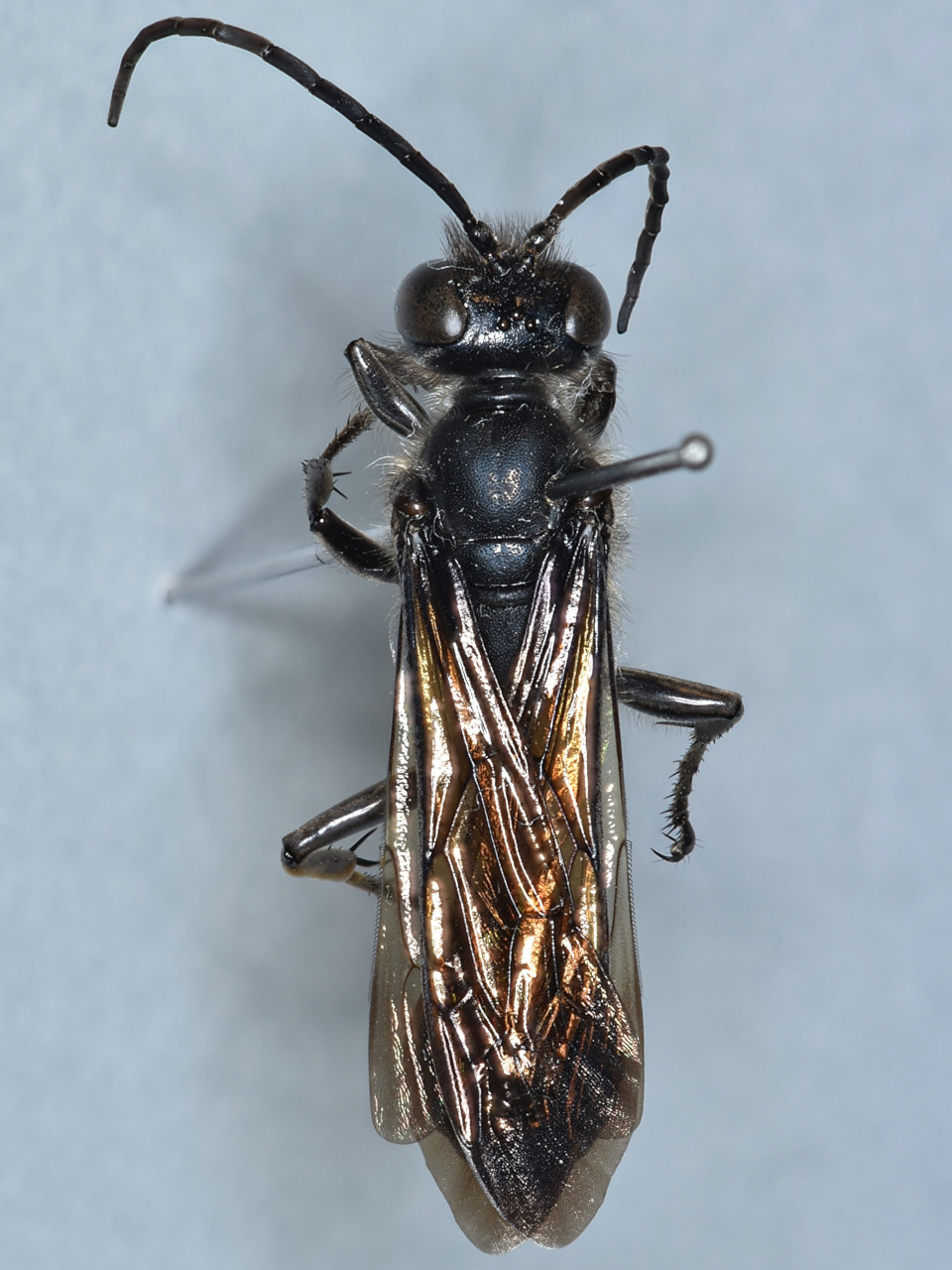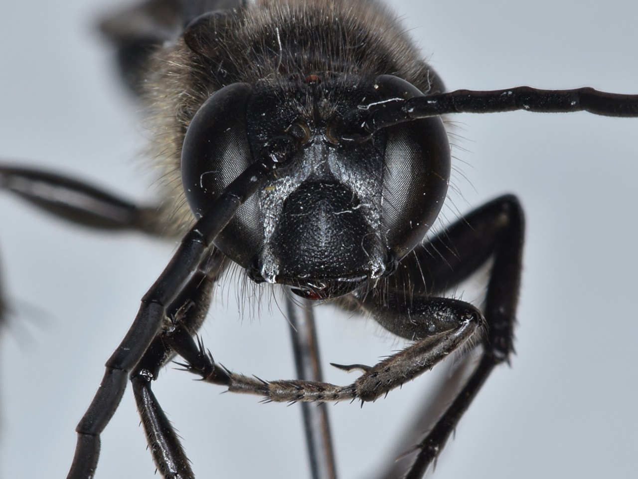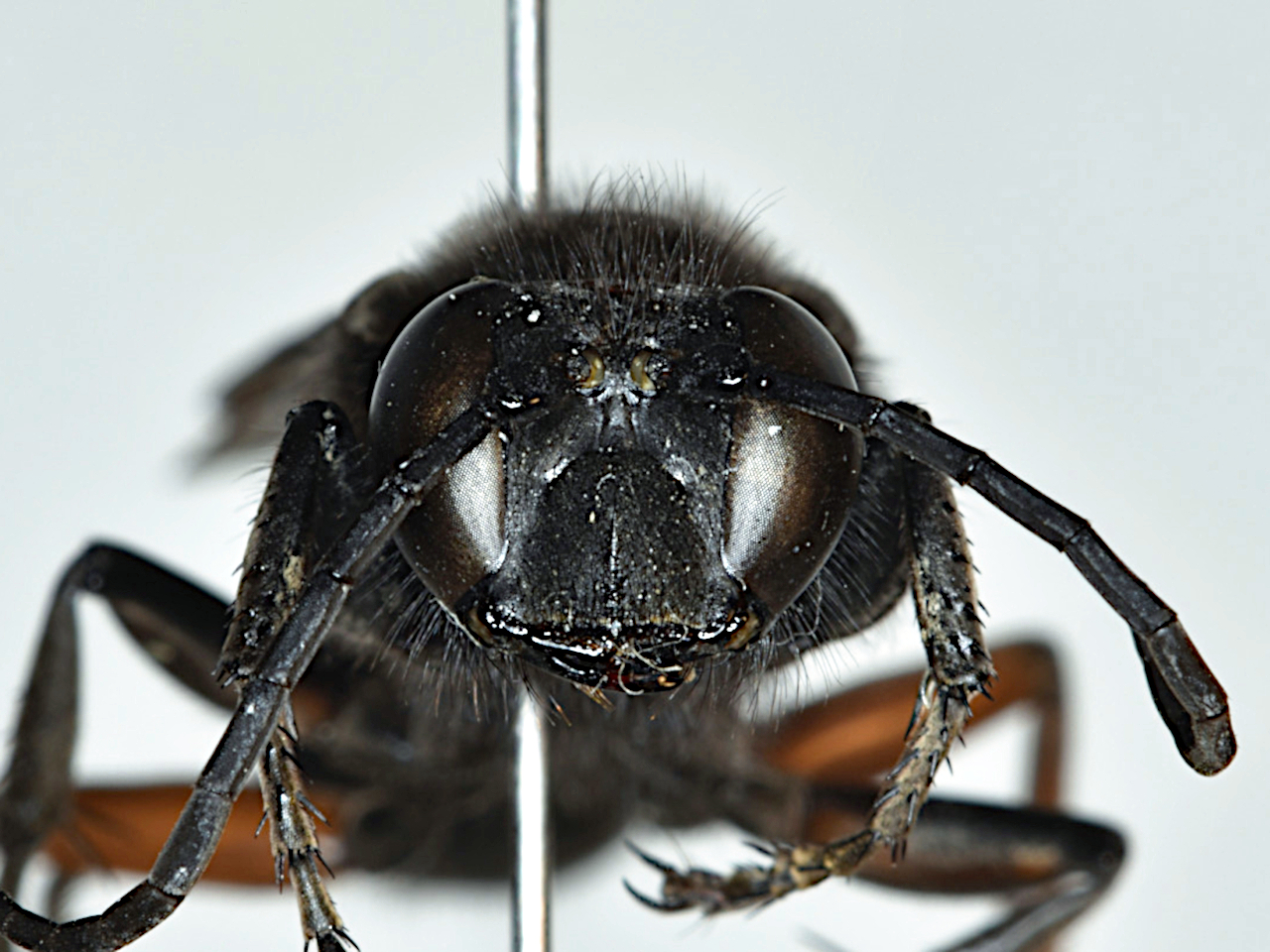 体は黒色で、後脚の腿節、脛節、付節は赤色。枯木の孔や竹筒に主にコケを使って仕切りを作り営巣する。幼虫の餌としてササキリ類やツユムシ類などを狩る。1つの育室に複数の幼虫が共存する。巣材にコケを使うためか、沢沿いの林内など比較的湿った環境に多い。