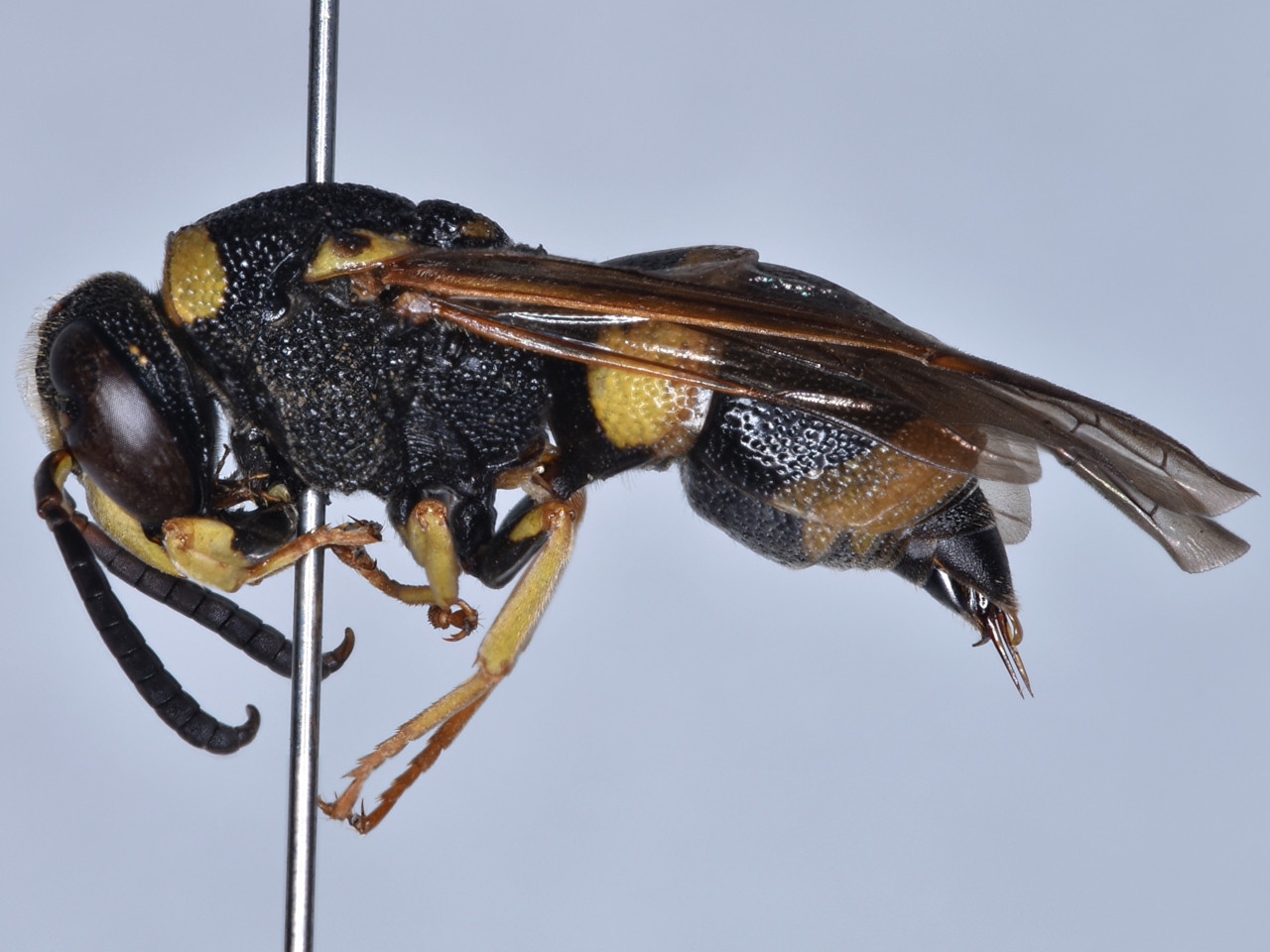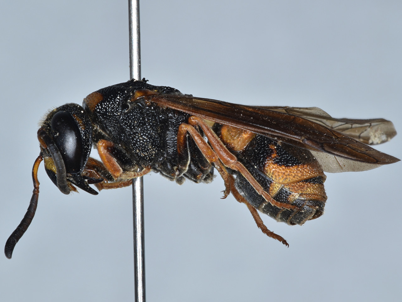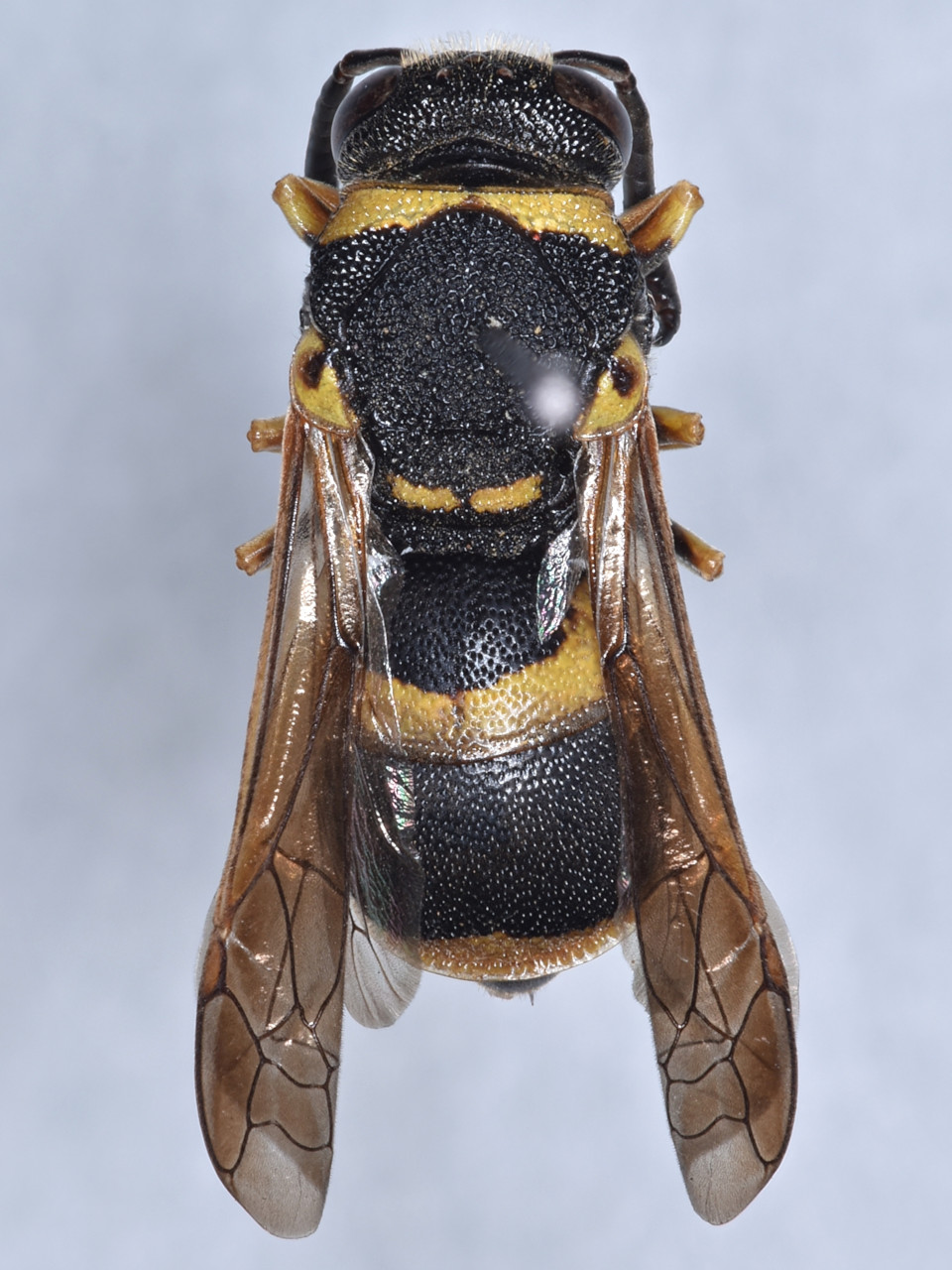 体は黒色で、腹部第1~3背板に黄色の帯がある。腹部第1背板の黄色帯がU字型で太いのが特徴。竹筒などに泥の仕切りを作って営巣する。幼虫の餌としてメイガ類、ハマキガ類、シャクガ類などの幼虫を狩る。地域によって2亜種に分けられている。