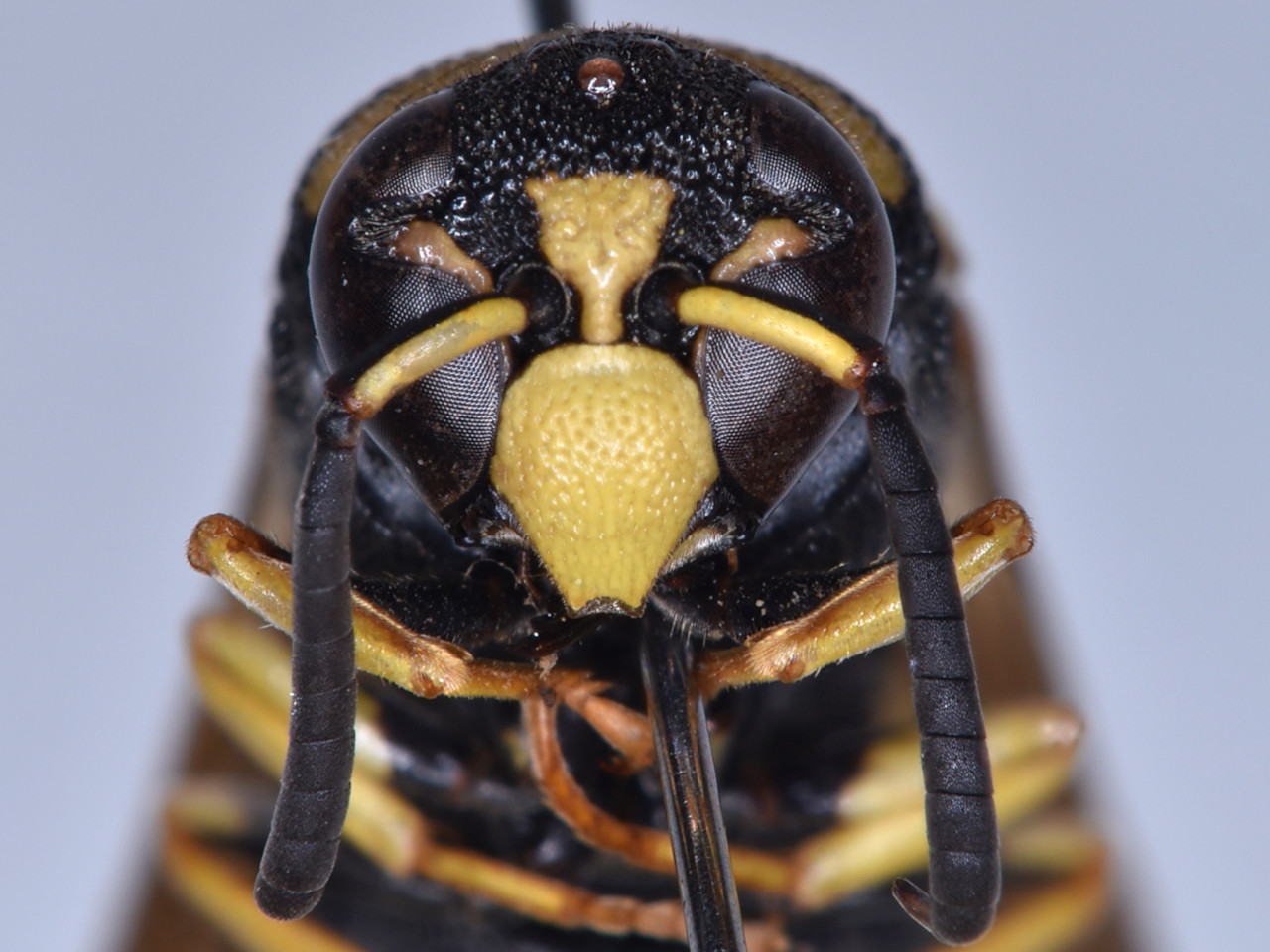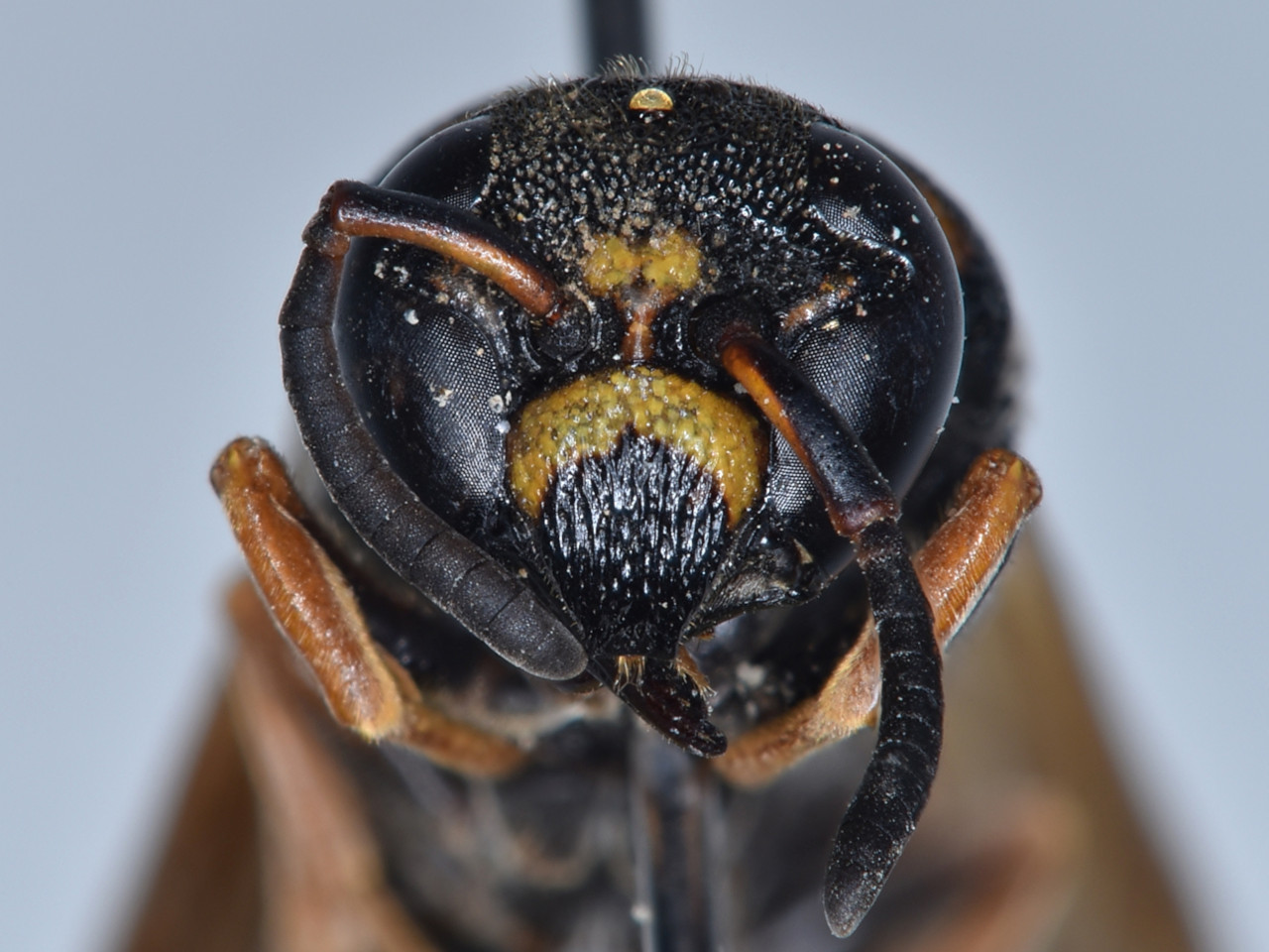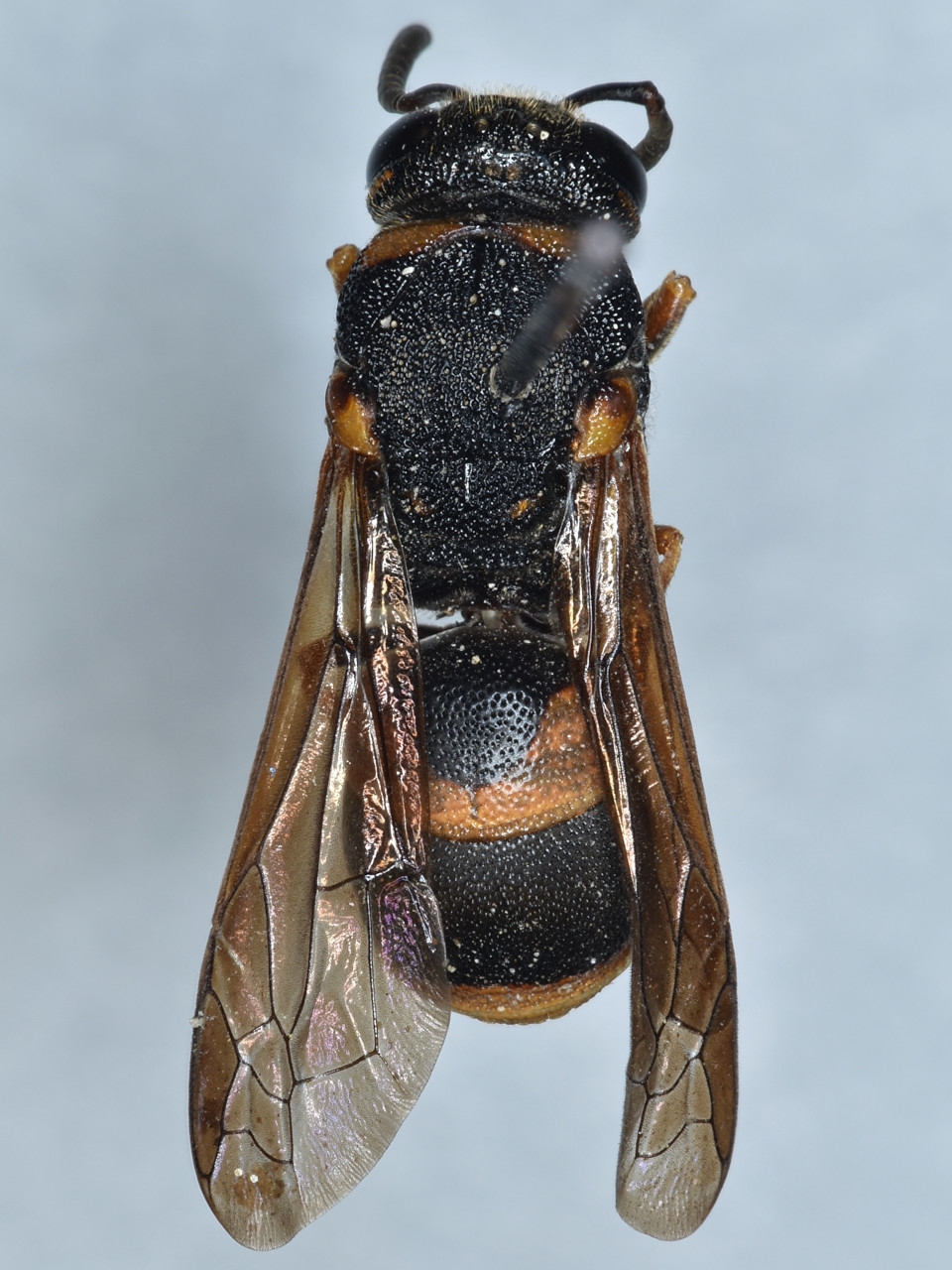 体は黒色で、腹部第1~3背板に黄色の帯がある。腹部第1背板の黄色帯がU字型で太いのが特徴。竹筒などに泥の仕切りを作って営巣する。幼虫の餌としてメイガ類、ハマキガ類、シャクガ類などの幼虫を狩る。地域によって2亜種に分けられている。