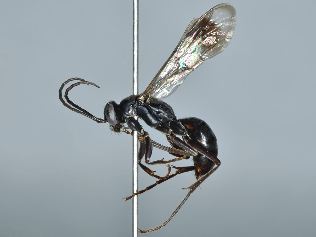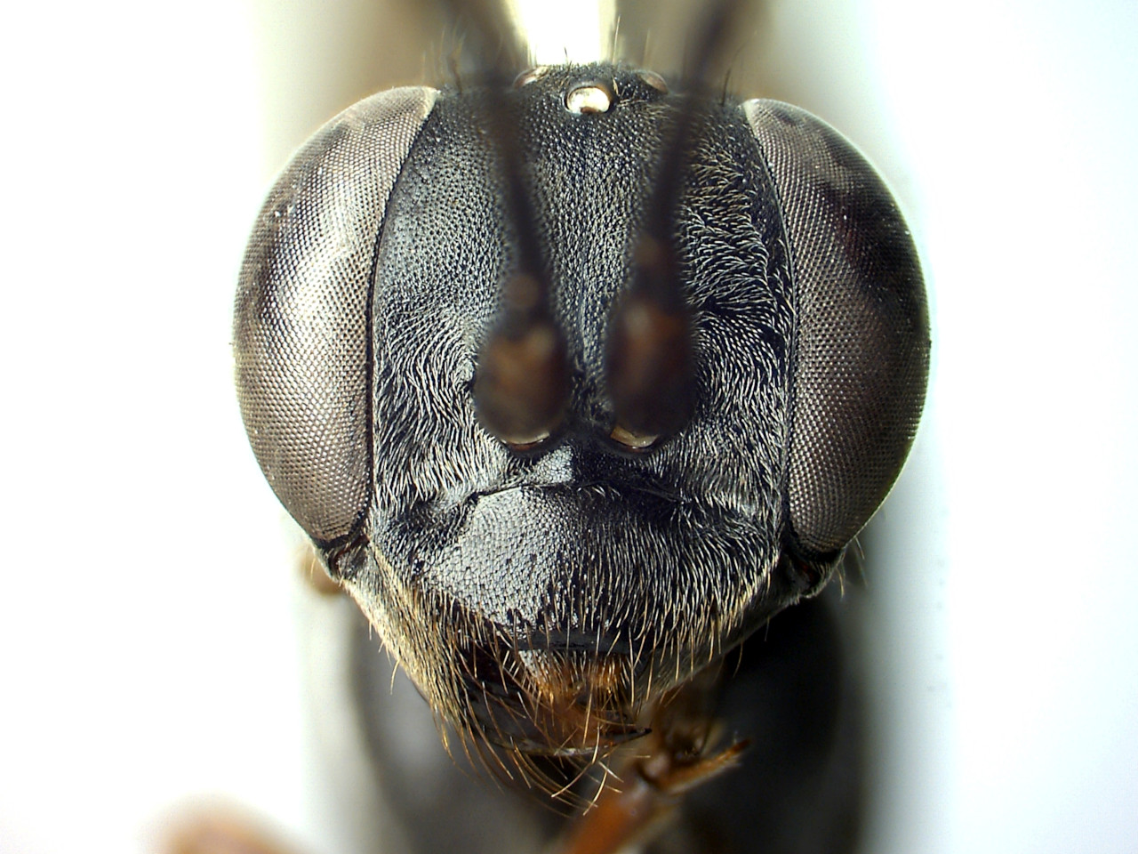 体は黒色で、前翅の先端近くに白斑がある。中・後脚腿節下面に短い毛が少数ある。