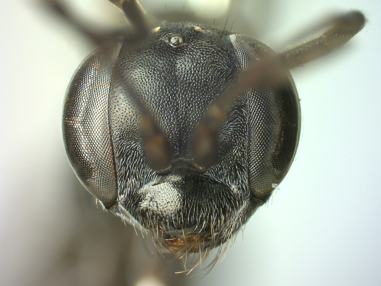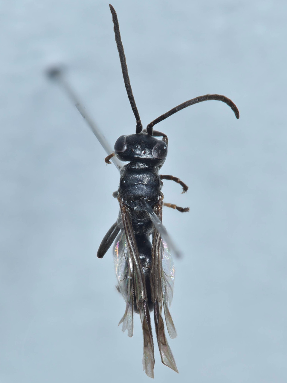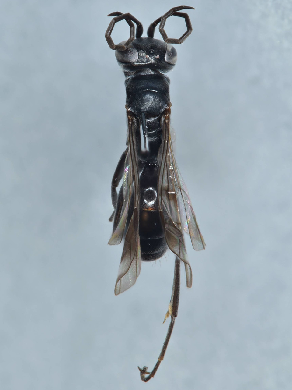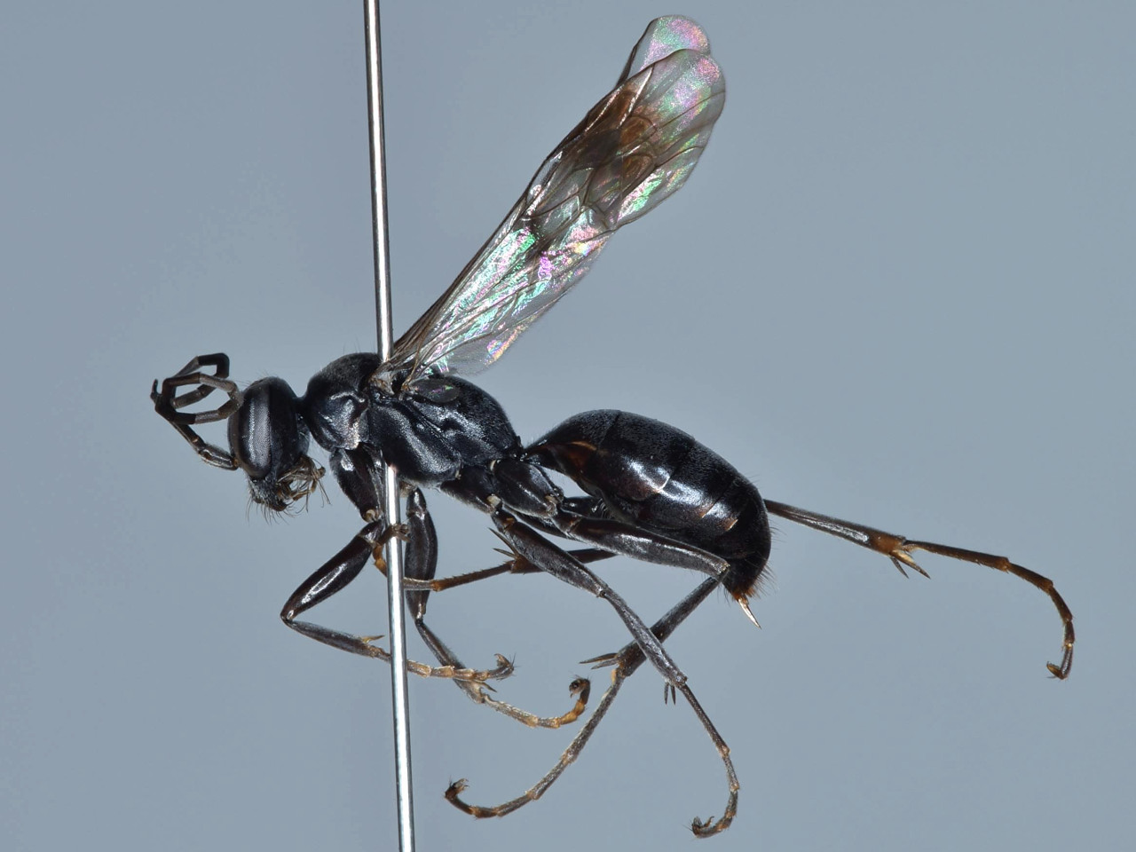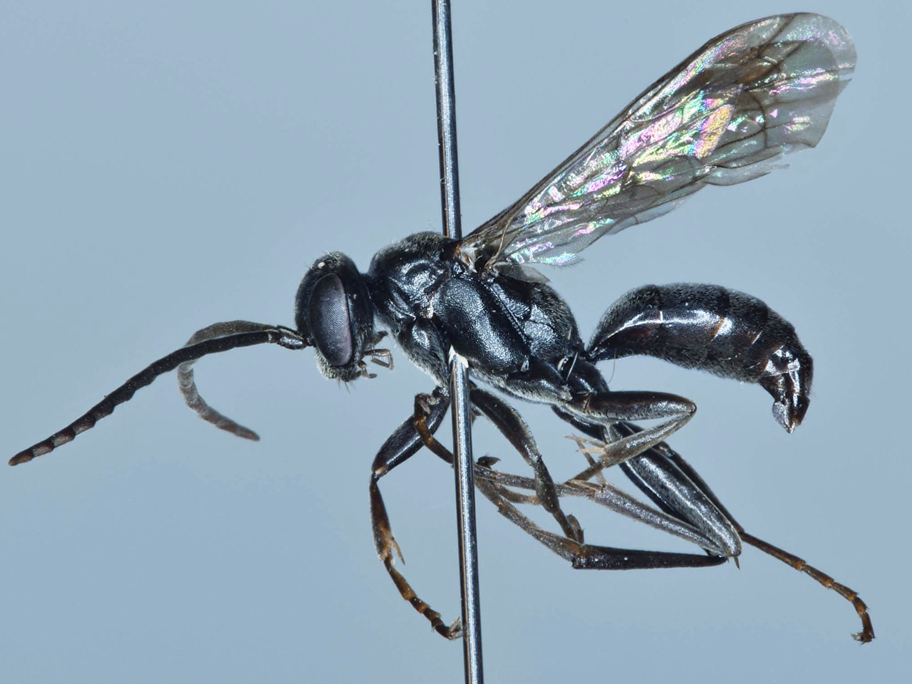 体は黒色で、前翅の先端近くに大きな白斑がある。ニッポンヒゲクモバチに似ているが、頬の立毛は灰白色で長い。