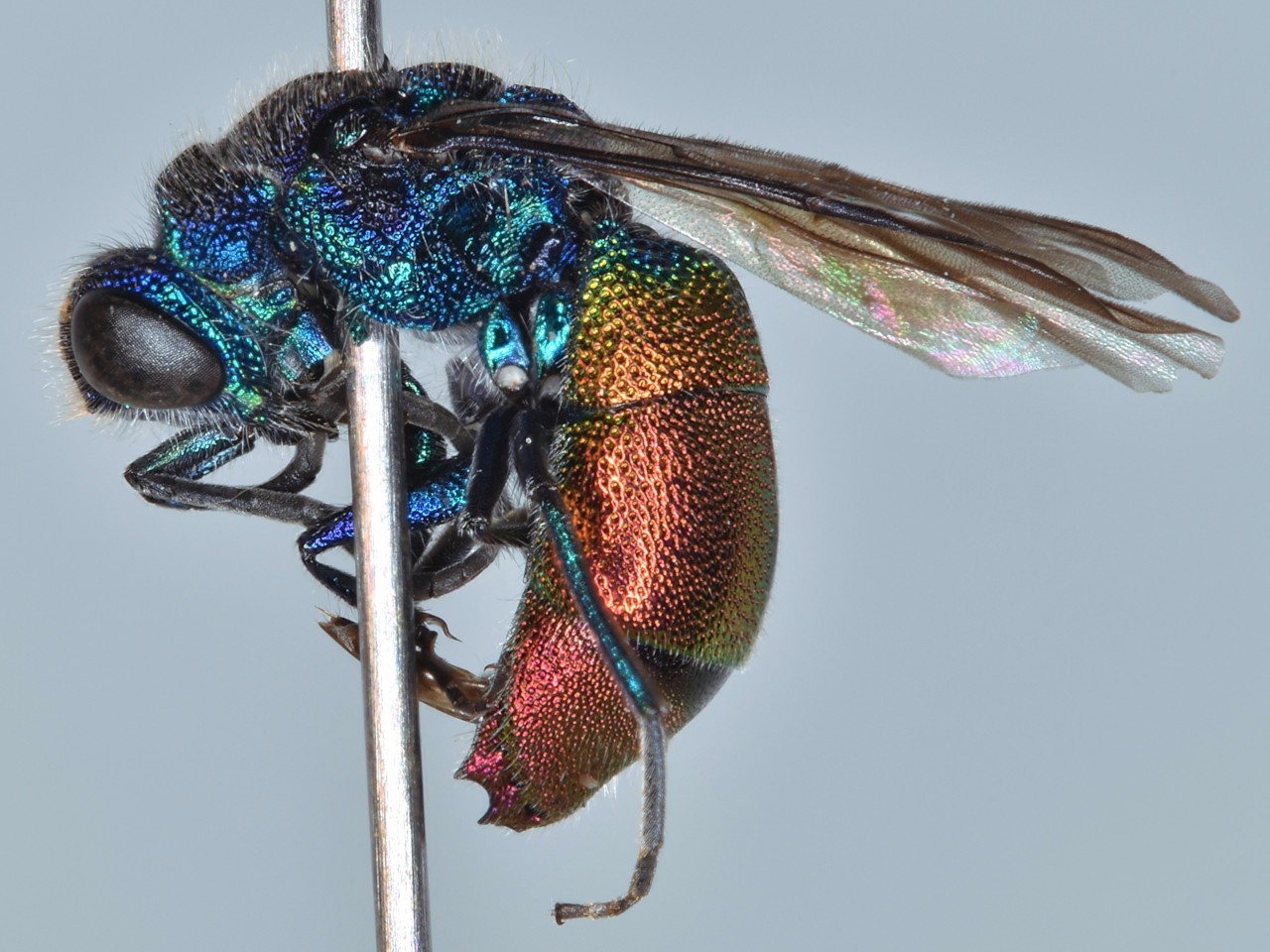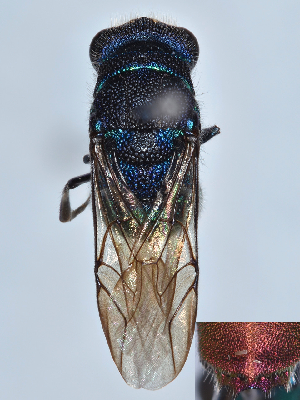 頭部と胸部は緑青色~黒緑色。腹部は主に赤色だが変異が多く、複数種が含まれている可能性がある。腹部末端(第3節の後縁)に4歯がある。