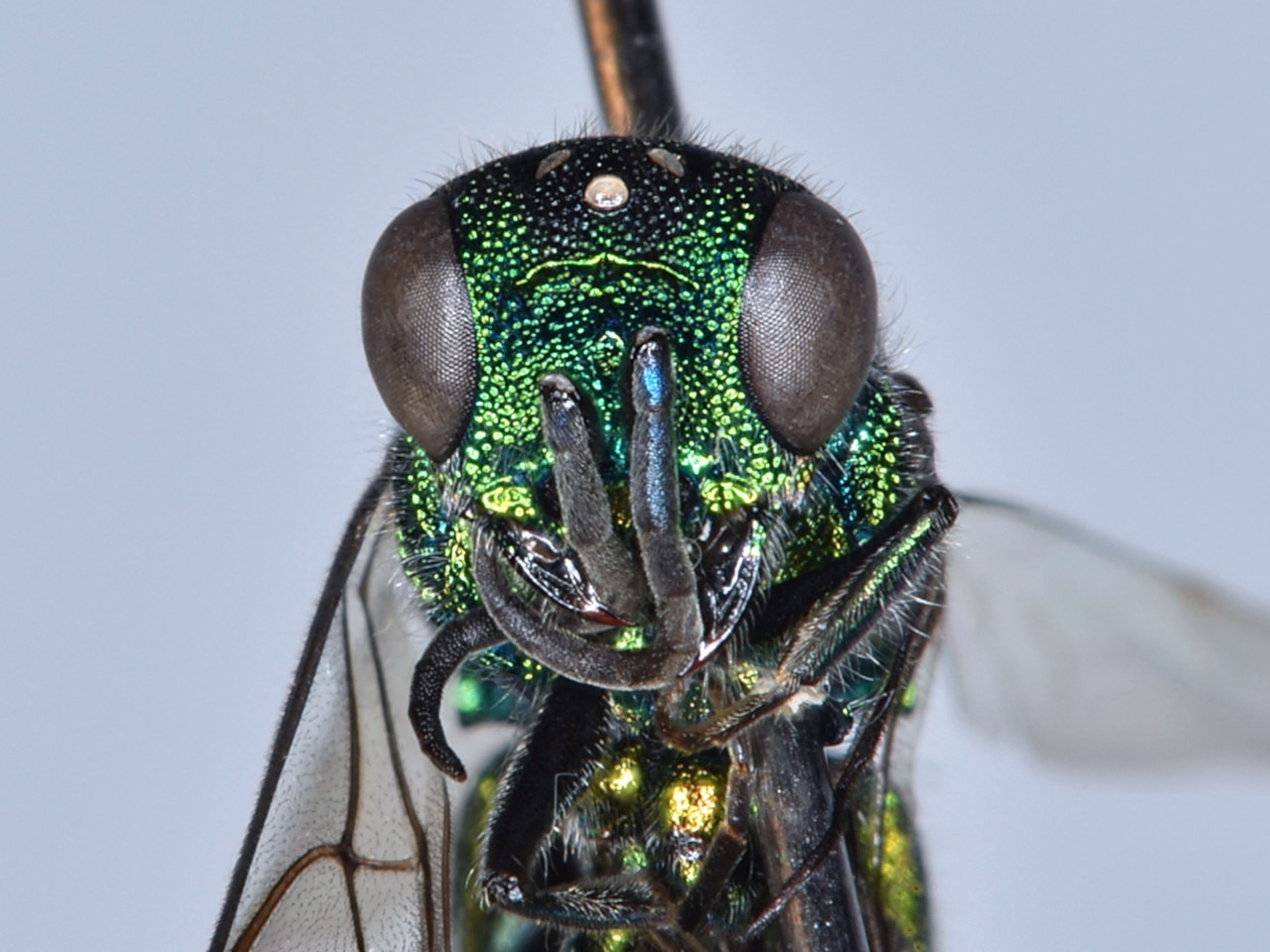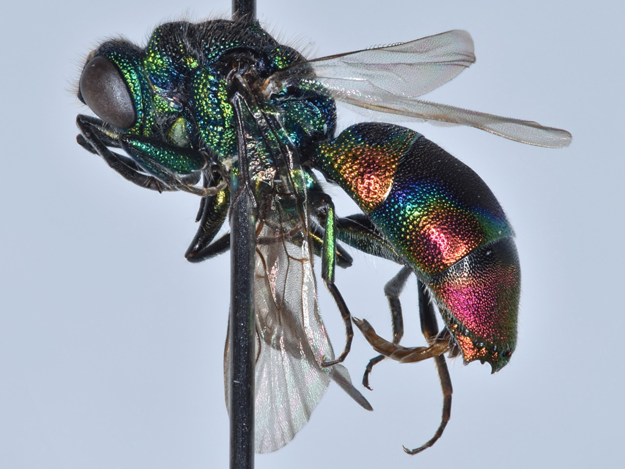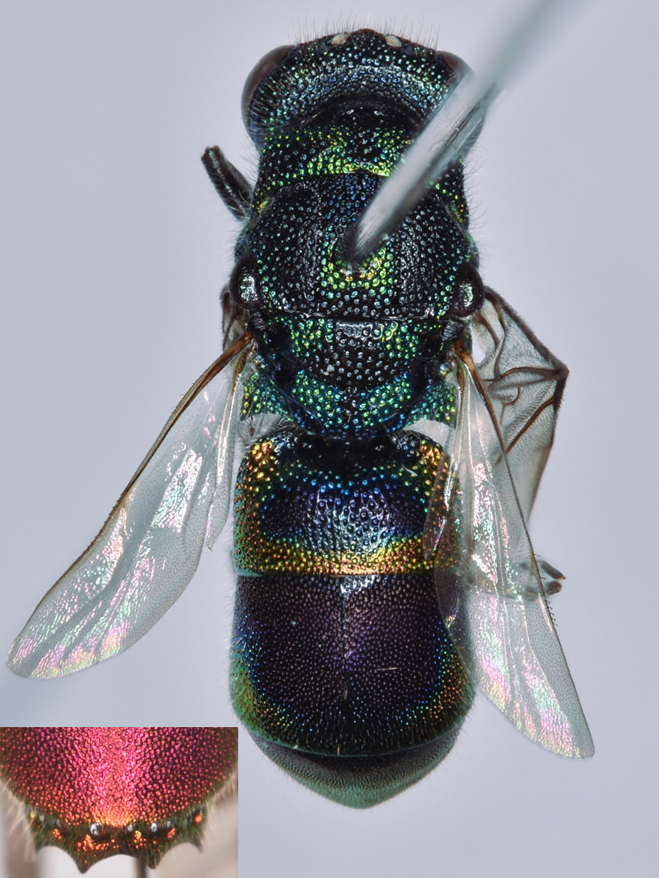 頭部と胸部は金緑色~暗紫色。腹部第3背板は赤紫色で,後縁に4歯がある。