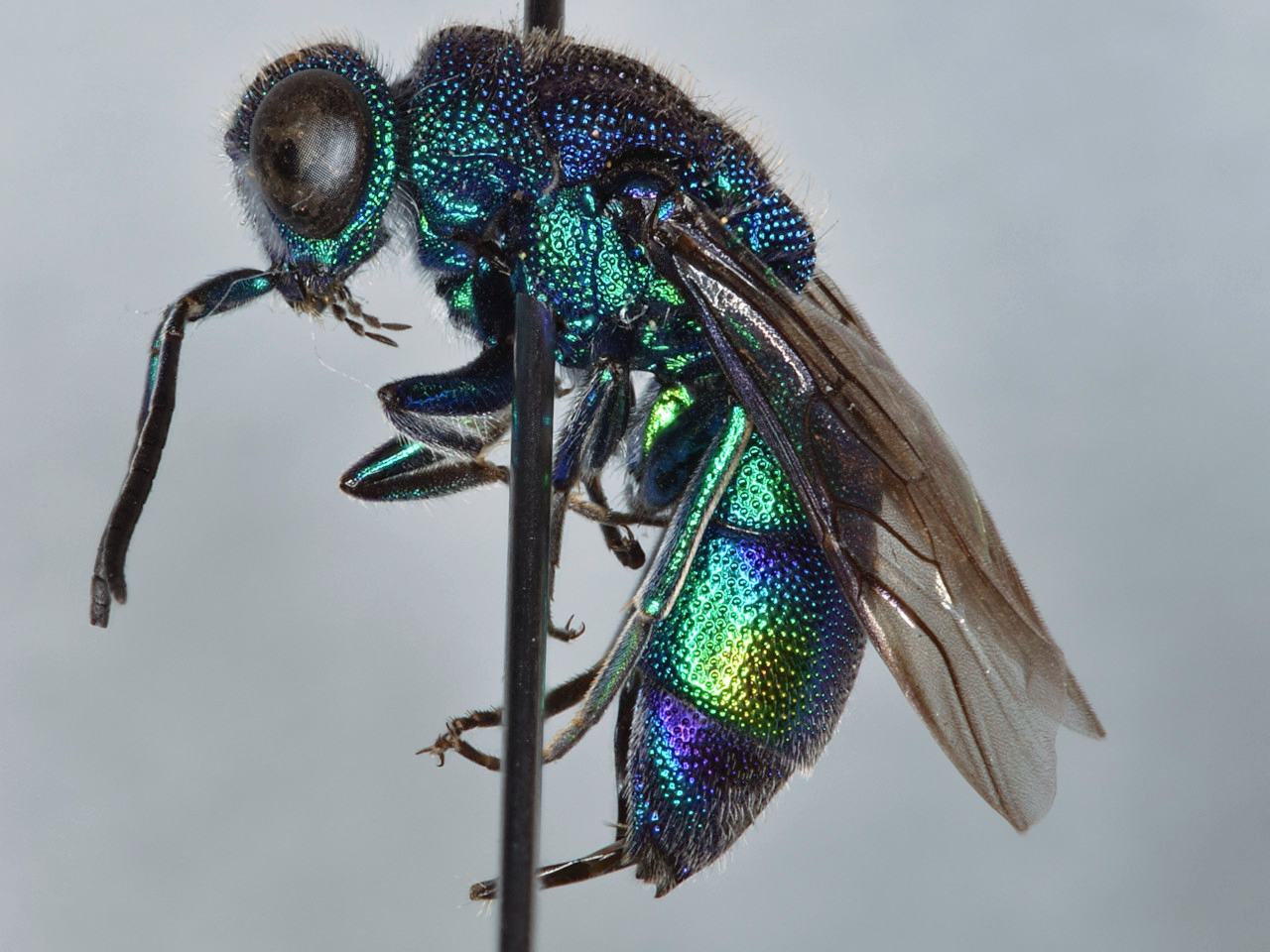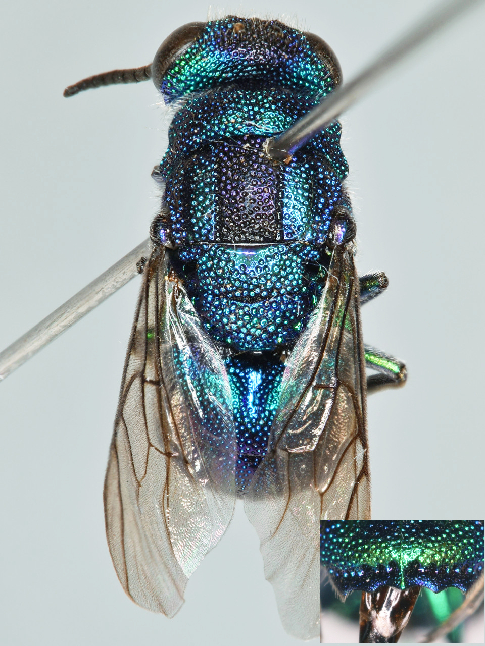 体は緑色~青緑色。中胸背板の中央が暗紫色で長方形の模様に見える。腹部末端(第3節の後縁)に5歯がある。