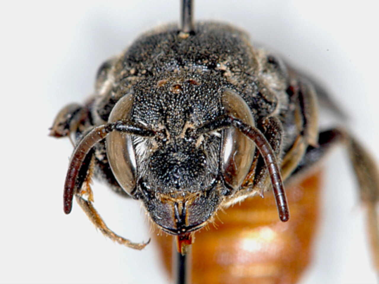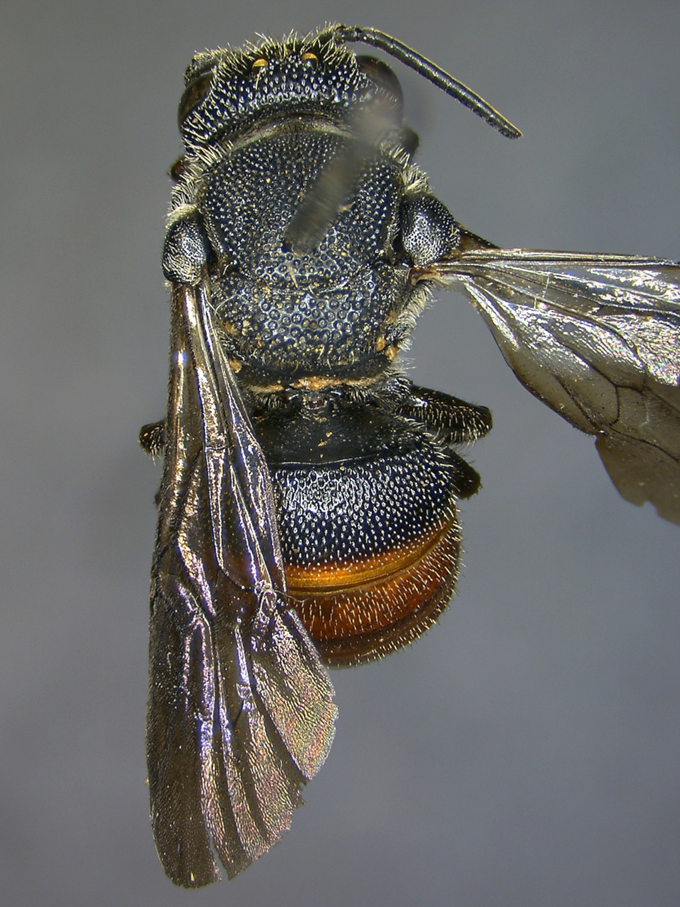 Head, thorax and first gastral segment mostly black in both sexes; second and later gastral segments dark red. Body entirely with strong punctures. This species is a cleptoparasite (labor parasite) of Megachile sculpturalis: its larvae feed on pollen stored by the host. Eggs and larvae of the host are soon killed by the larvae of the parasite.