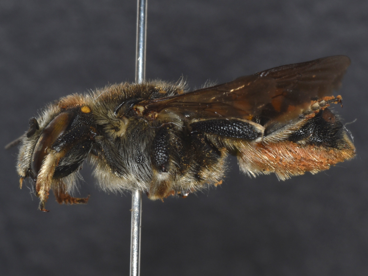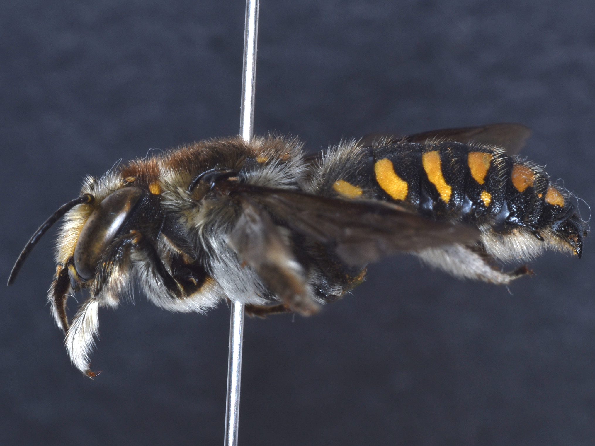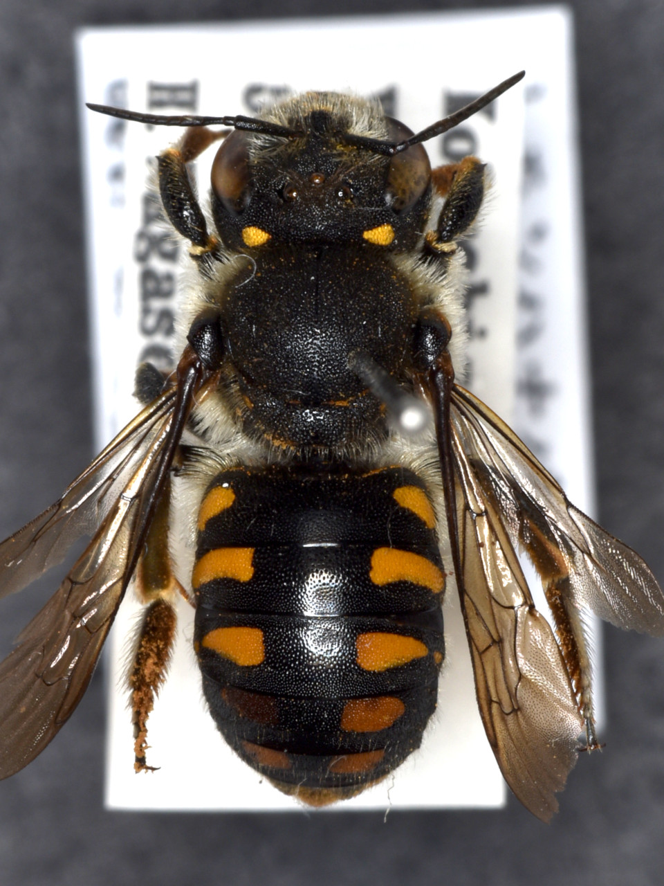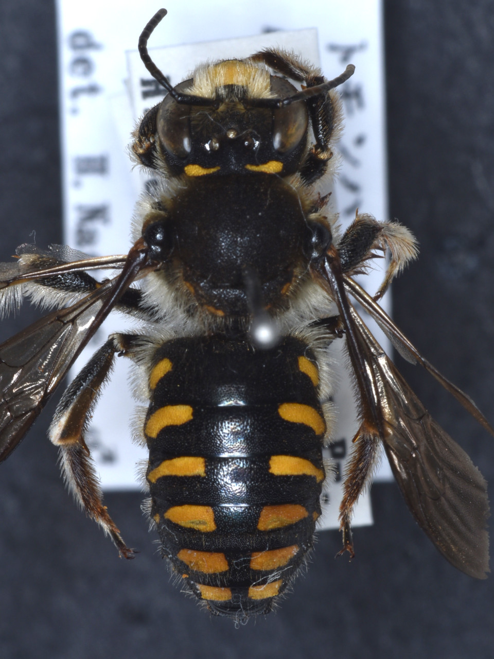 Body black with yellow spots on both sides of gastral tergites except terminal segment. This species nests in bamboo tubes or small crevices in buildings, stuffing them with plant materials like pile of mugwort.