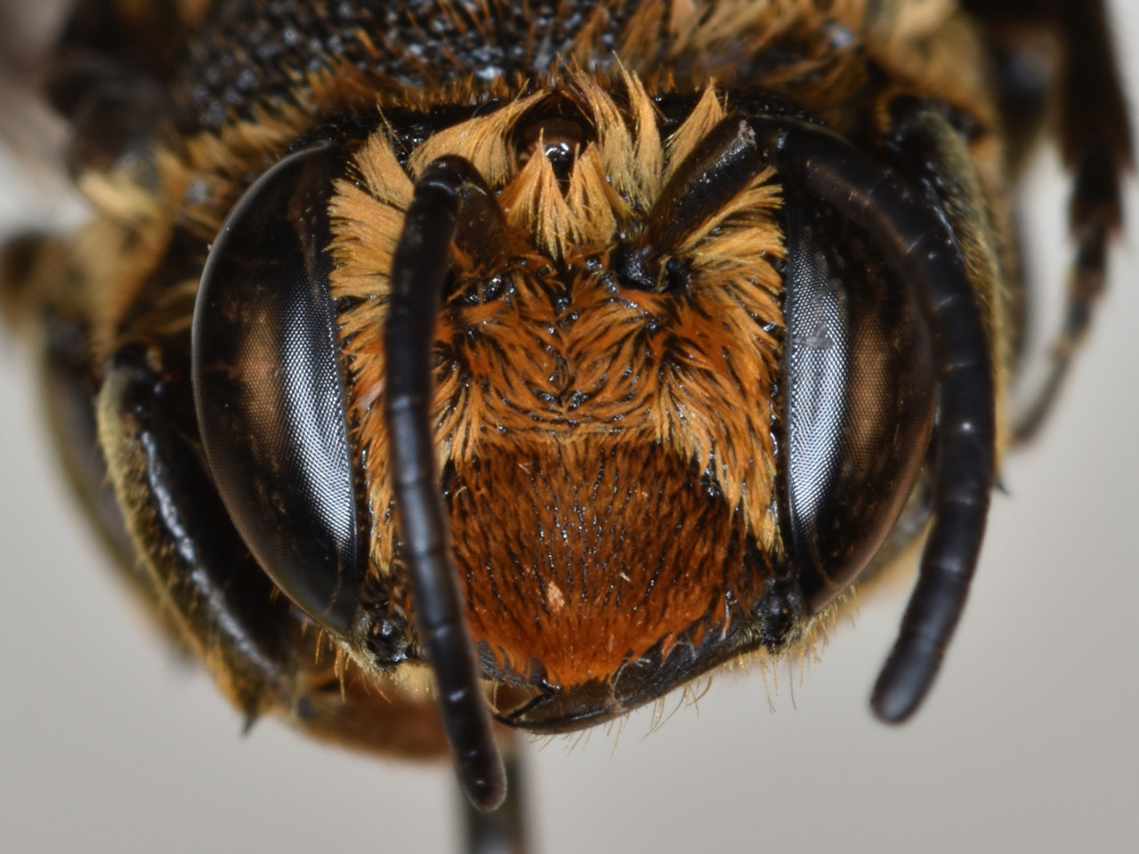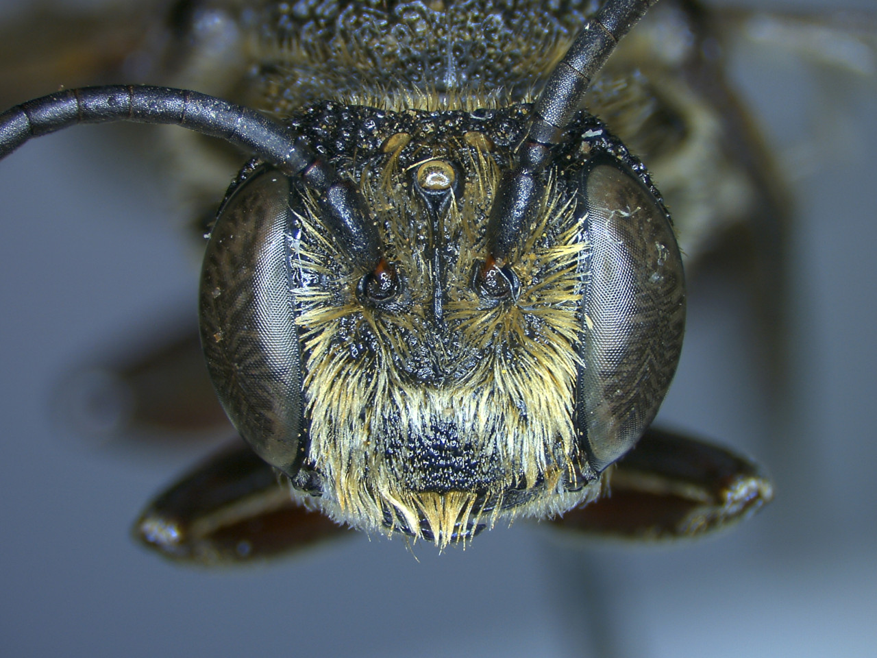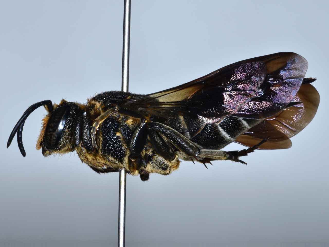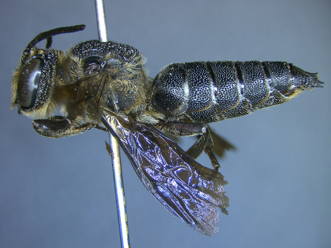Coelioxys fenestrata Smith, 1873 Body black. Face of female densely covered with reddish brown hairs. End of each gastral segment has a narrow transverse band of white hairs. More than half of the wings are blackish brown with a purple sheen. All species of the genus Coelioxys are cleptoparasites of other bees. This species parasitizes Megachile sculpturalis.