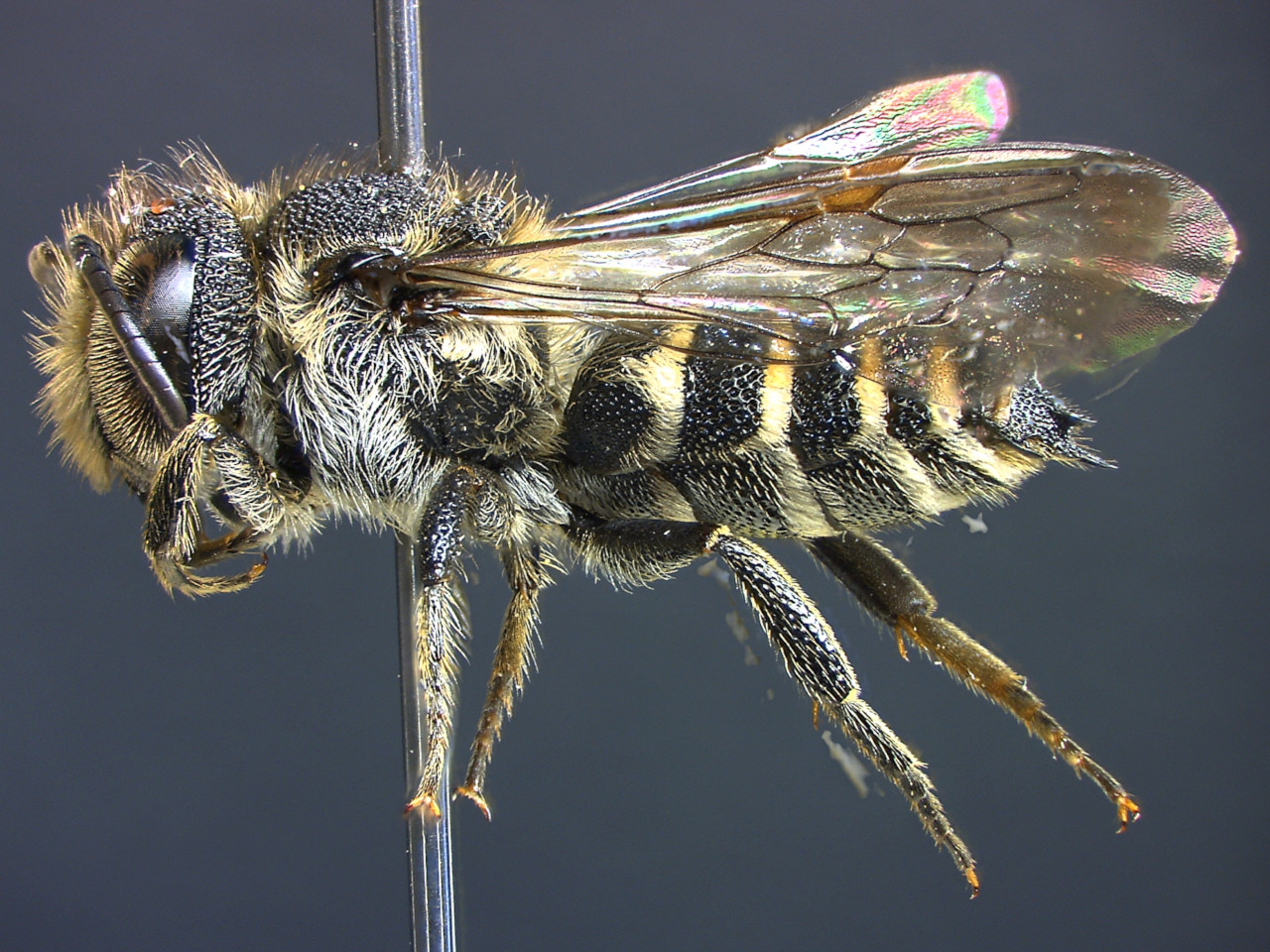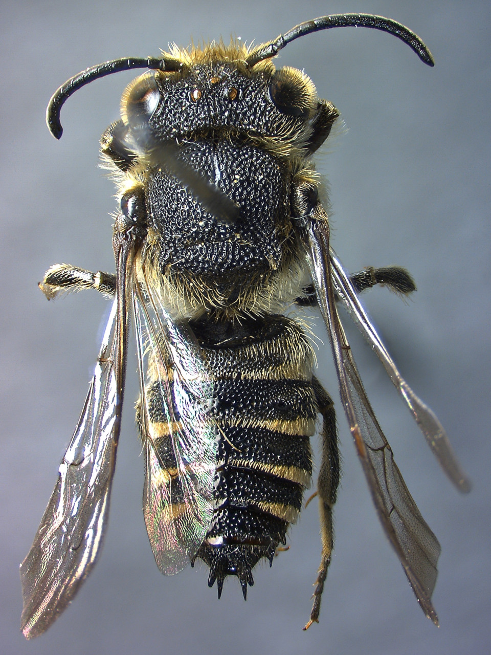 Coelioxys hiroba Nagase, 2003 Body black, with white to grayish brown body hairs. Posterior margin of gastral segments 1-5 with a hair band. This species differs from the closely related Coelioxys hosoba in that mandibles of female are nearly parallel at the base, abruptly narrowing at the tip. This species parasitizes Megachile tsurugensis or related species.