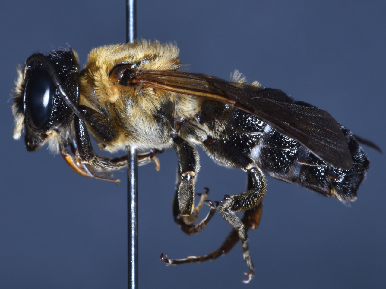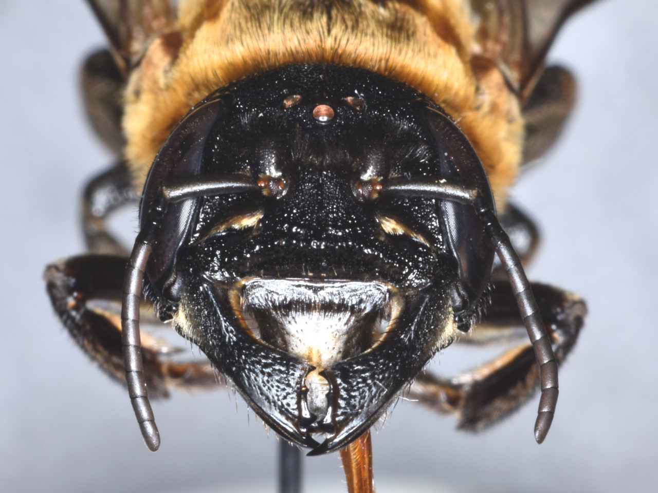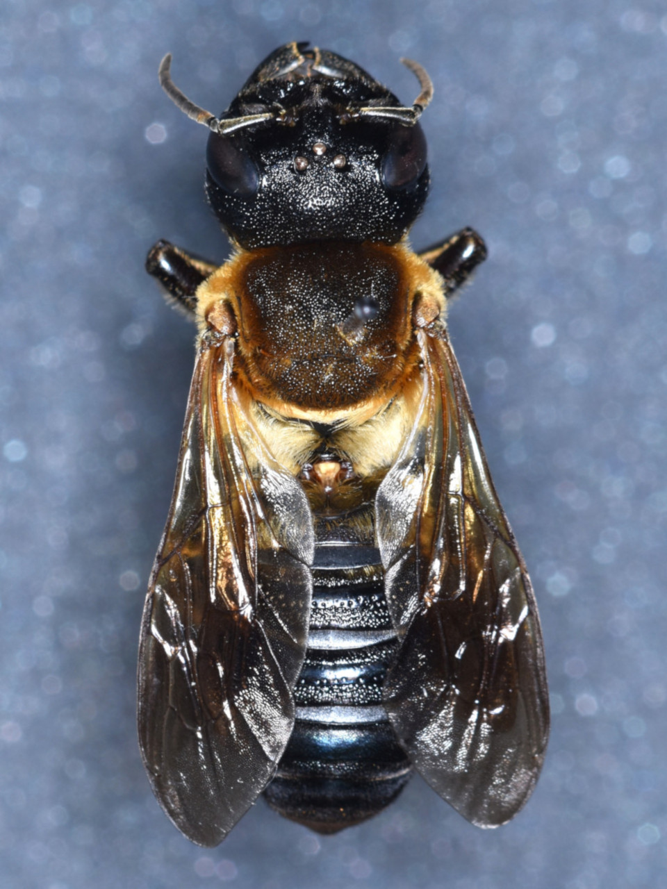 Body black with yellowish brown hairs on the thorax, resembling Megachile pseudomonticola at first sight. It nests in bamboo tubes or borings in wood made by cerambycid beetles. Unlike most megachilid bees, it uses resin (of pine, etc.) to build its nest. This species is a frequent user of bamboo traps, filling the nests with resin.