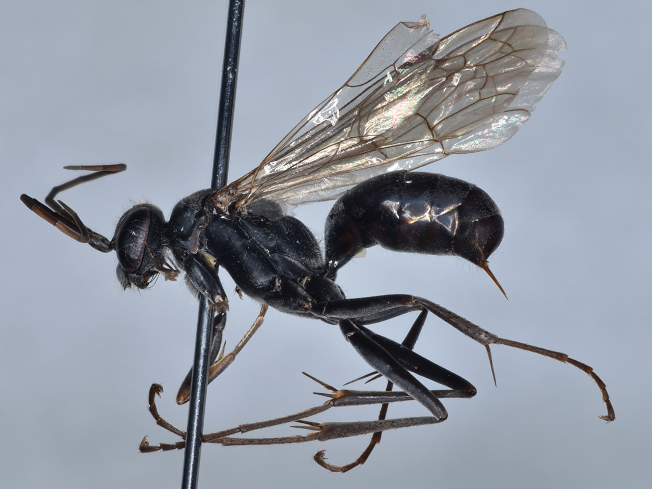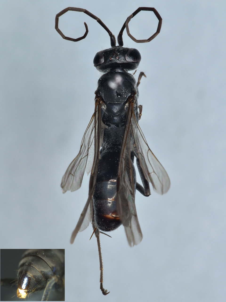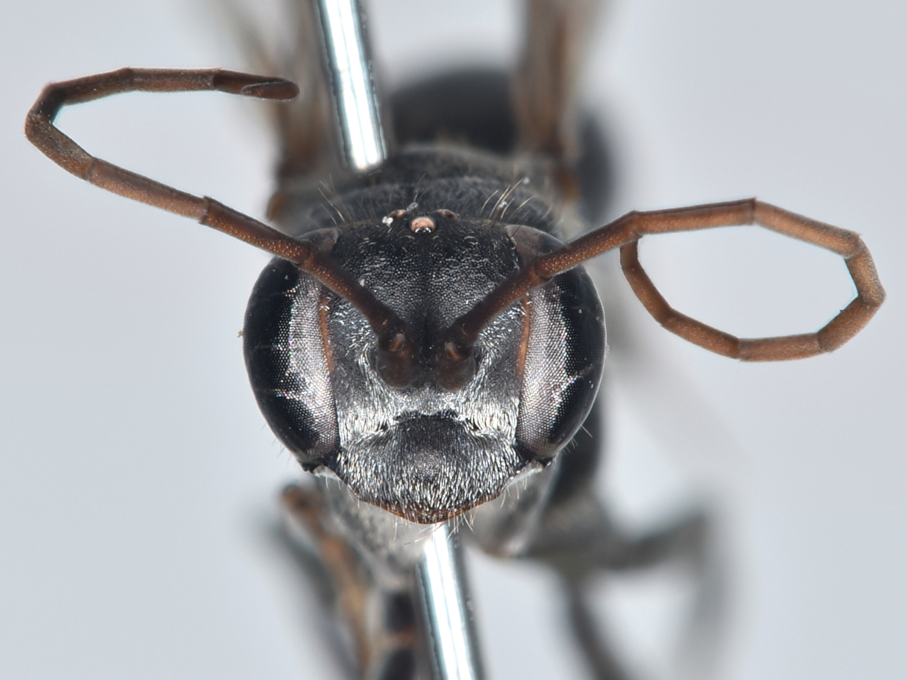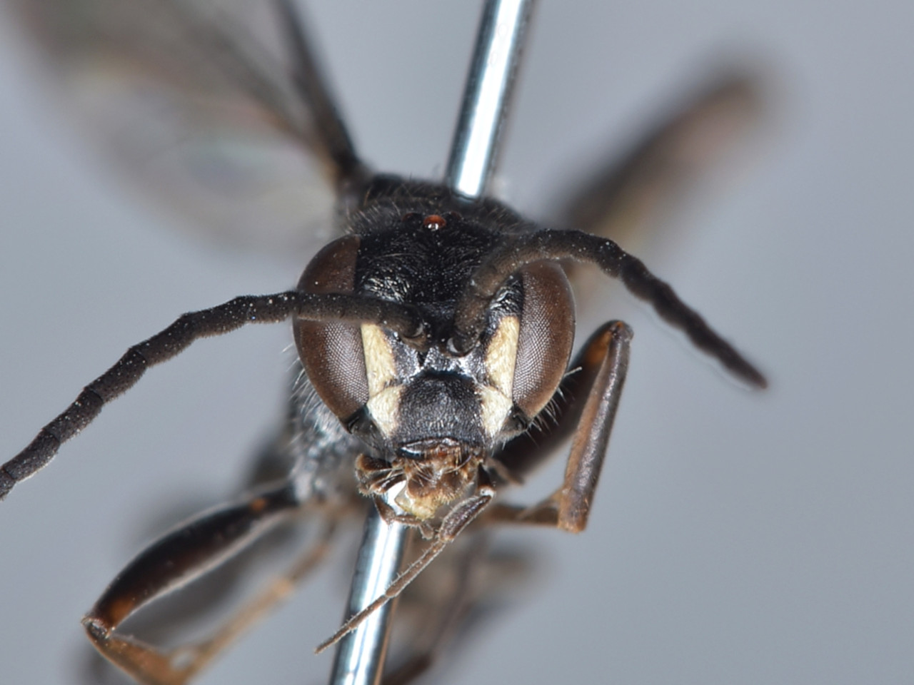 Auplopus carbonarius (Scopoli, 1763) Females have a hairless, shiny area on the sixth dorsal tergite; males have a yellowish-white band on either side of their face (the two bands not connected). This species builds several vase-shaped cells made of mud in relatively thick bamboo tubes. It is particularly common in forests, but its identification is difficult because of closely related congeneric species.