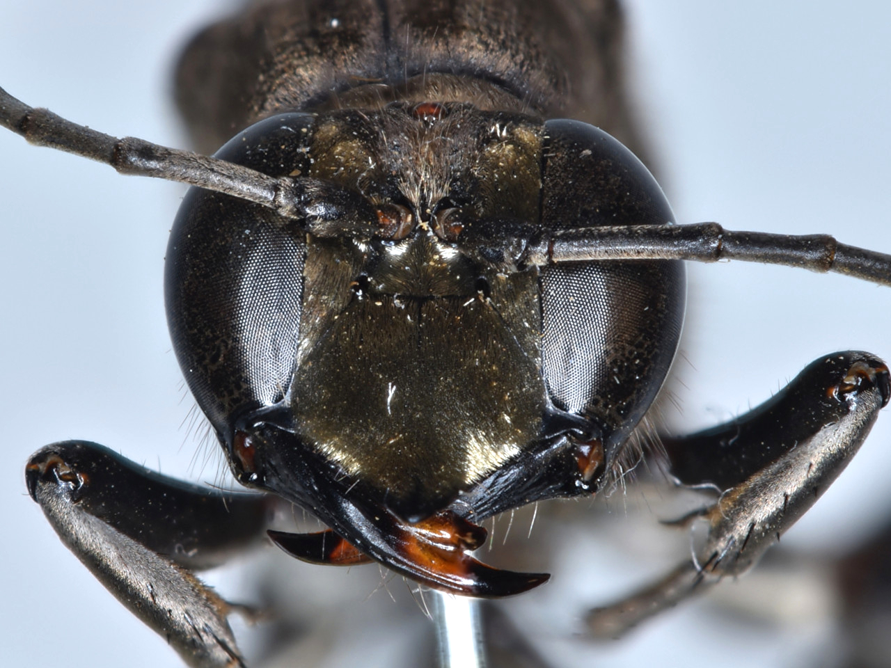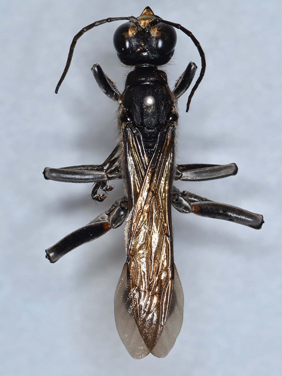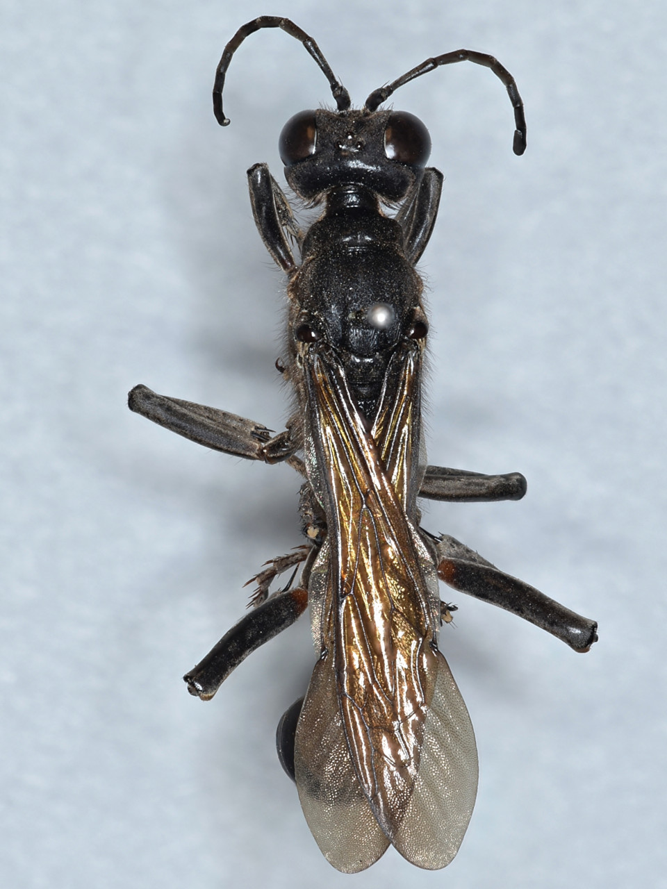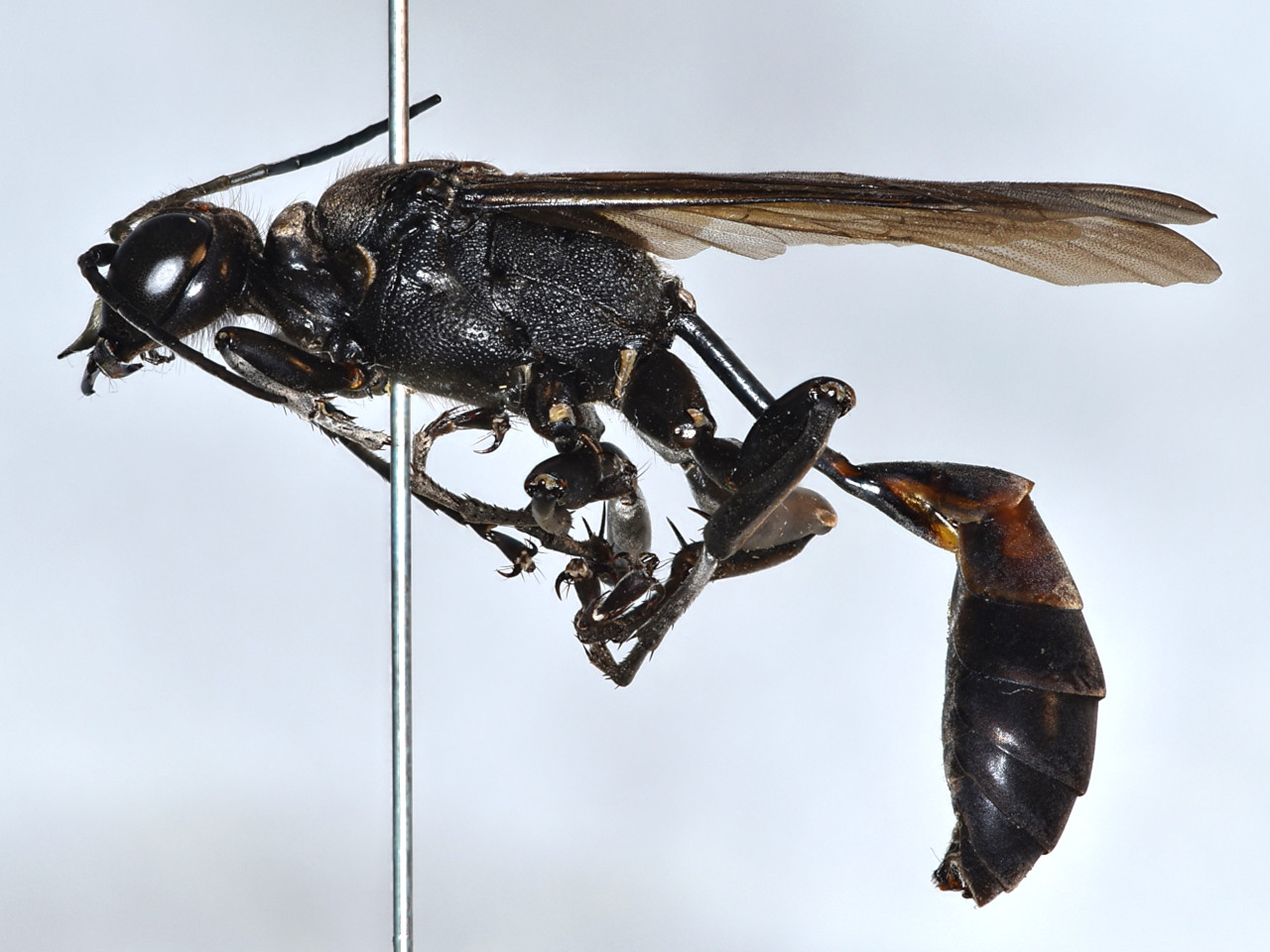 Hoplammophila aemulans (Kohl, 1901) Body black, first gastral segment distally and second segment entirely red. This species uses tiny pebbles or wood chips to construct nests in tree cavities or bamboo tubes. It hunts large larvae of notodontid moths as prey, and always stores a single larva in each cell. Sex ratios of adults produced from trap nests are often extremely female-biased.