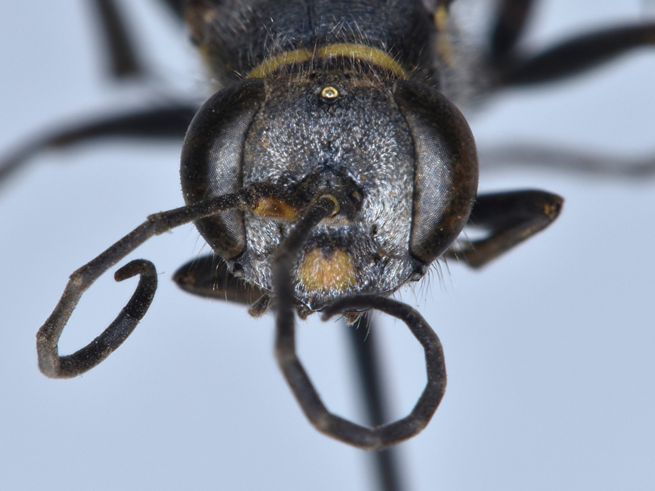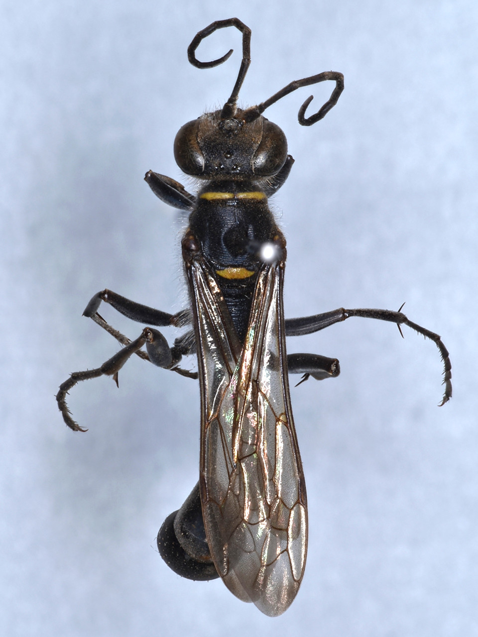 Sceliphron deforme (Smith, 1856) Body black, with yellow markings on pronotum, mesonotal pleuron, scutellum and propodeum. Posterior margins of first and second gastral segments reddish brown. This species is not basically a tube-renter, but sometimes builds pot-shaped mud nests in thick bamboo tubes. It hunts salticid spiders (jumping spiders).