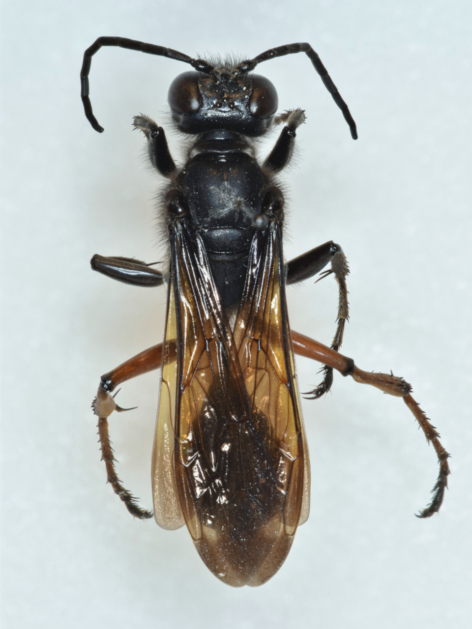 Body black, hind femora, tibiae, and femora red. This wasp nests in burrows in dead trees or bamboo tubes, using mainly moss to make partitions. It hunts tettigoniids for larval food. Multiple larvae often coexist in a single cell. This species is often found in relatively moist environments such as forests along streams, possibly because it uses moss as nest material.