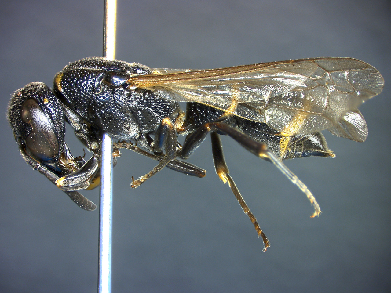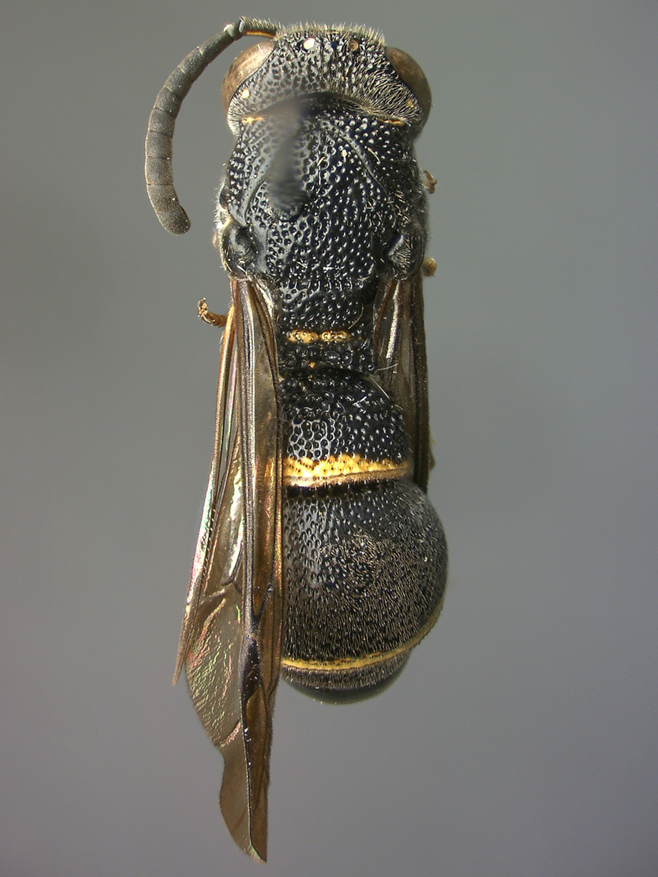 Body color black with a yellow band on the posterior margin of the first and second gastral tergites. Teglae blackish brown. In lateral view, the boundary between the horizontal and vertical portions of the anterior part of the first gastral tergite is not angular. This species nests in bamboo tubes, etc., with mud partitions, and hunts larvae of moths including Tortricidae.