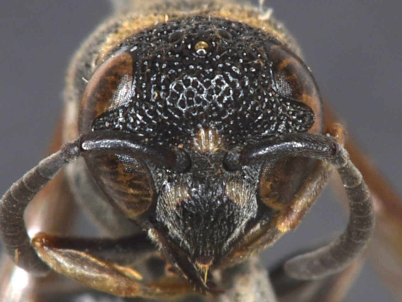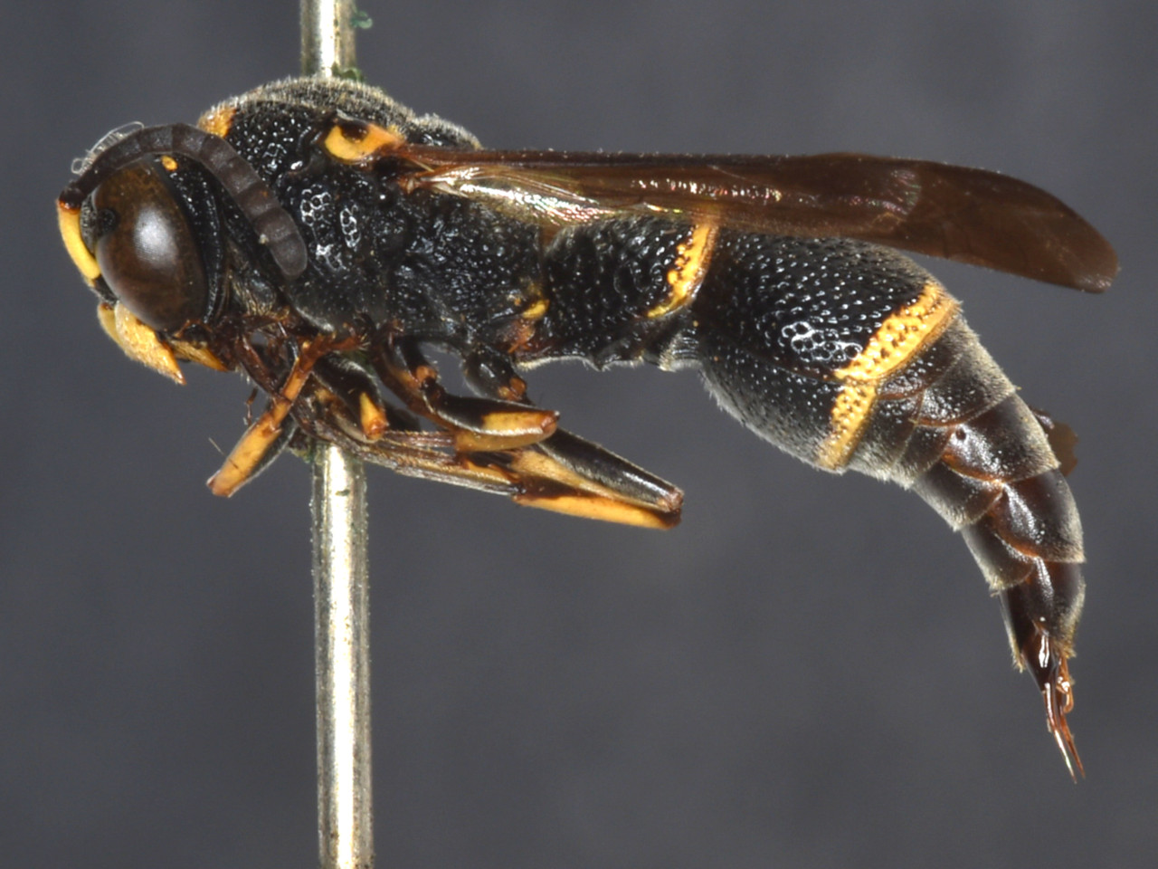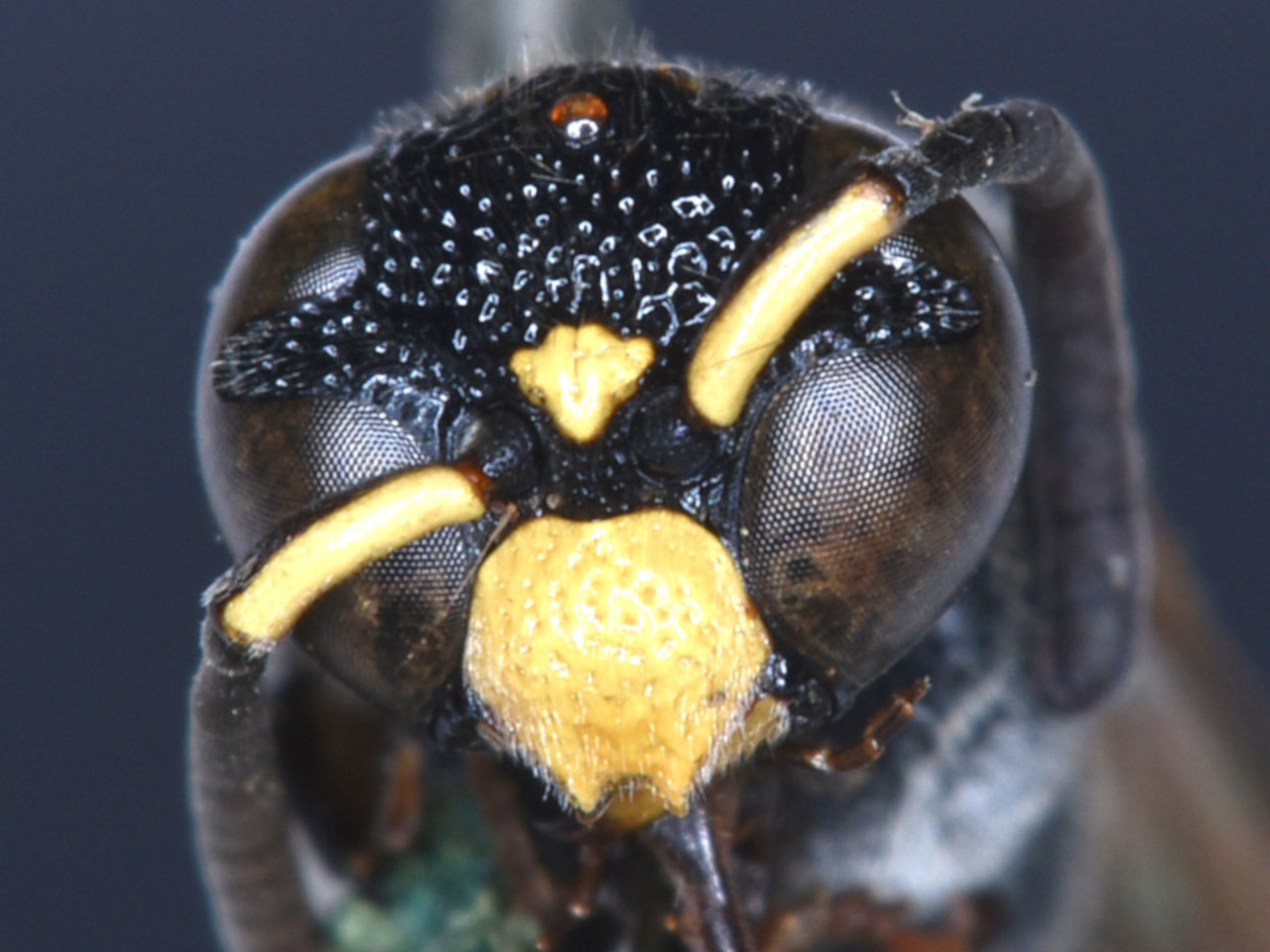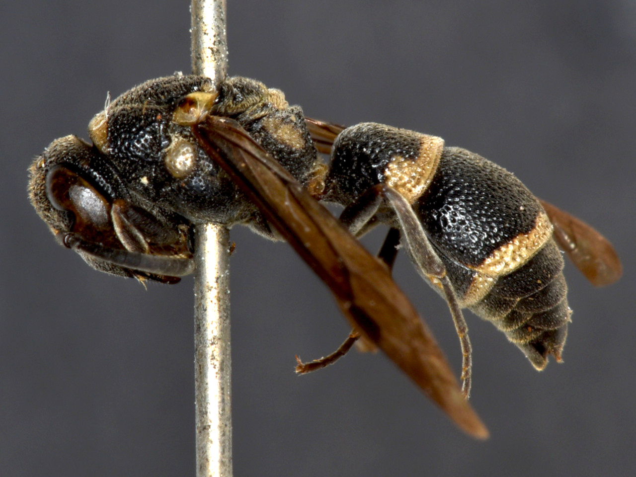 Body black with a yellow band on the posterior margin of the first and second gastral tergites. Very similar to Stenodynerus chinensis, though distinguishable by a yellow spot on the tegulae. It hunts moth larvae of Tortricidae, etc.