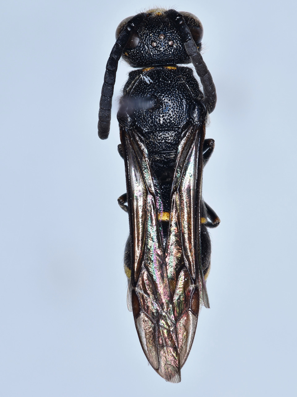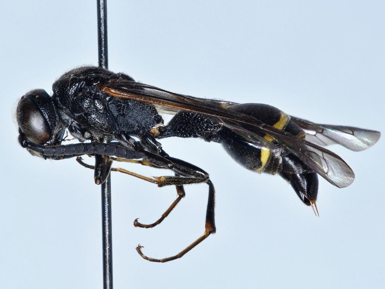 Symmorphus foveolatus Gussakovskij, 1933 Body black with a yellow band on posterior margins of the first, second and fourth gastral tergites. This species differs from the other species of the genus in that the first gastral tergite is distinctly longer than wide when viewed from above. Abdomen shining. Paired pits present behind the ocellar area. Mesonotal dorsum with two longitudinal grooves, and one longitudinal groove in the middle of the first gastral tergite. This species nests in straw or reed tubes with mud partitions, and hunts larvae of leaf beetles (Chrysomelidae).