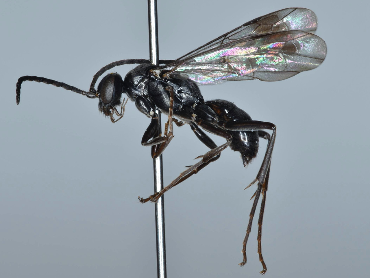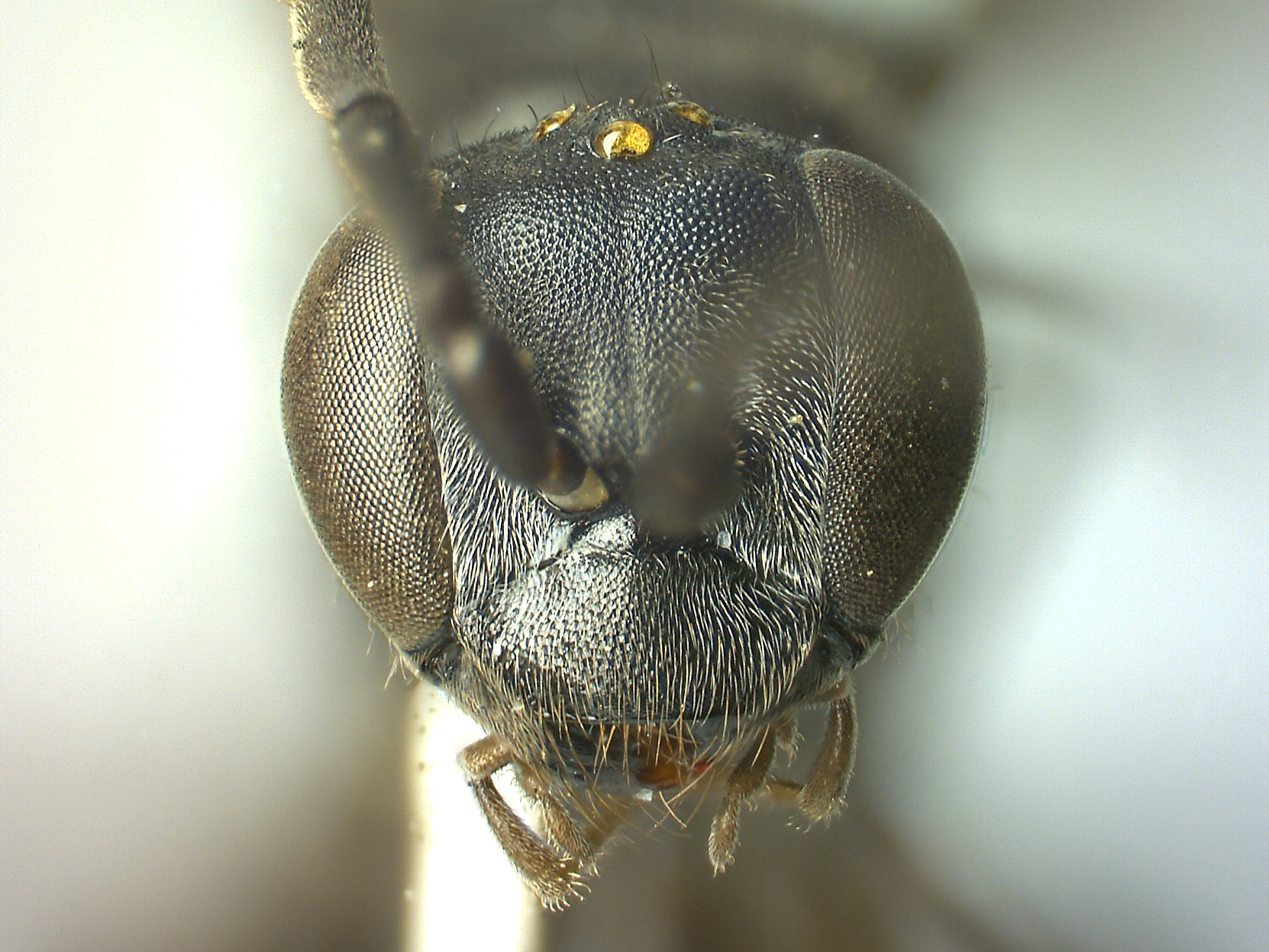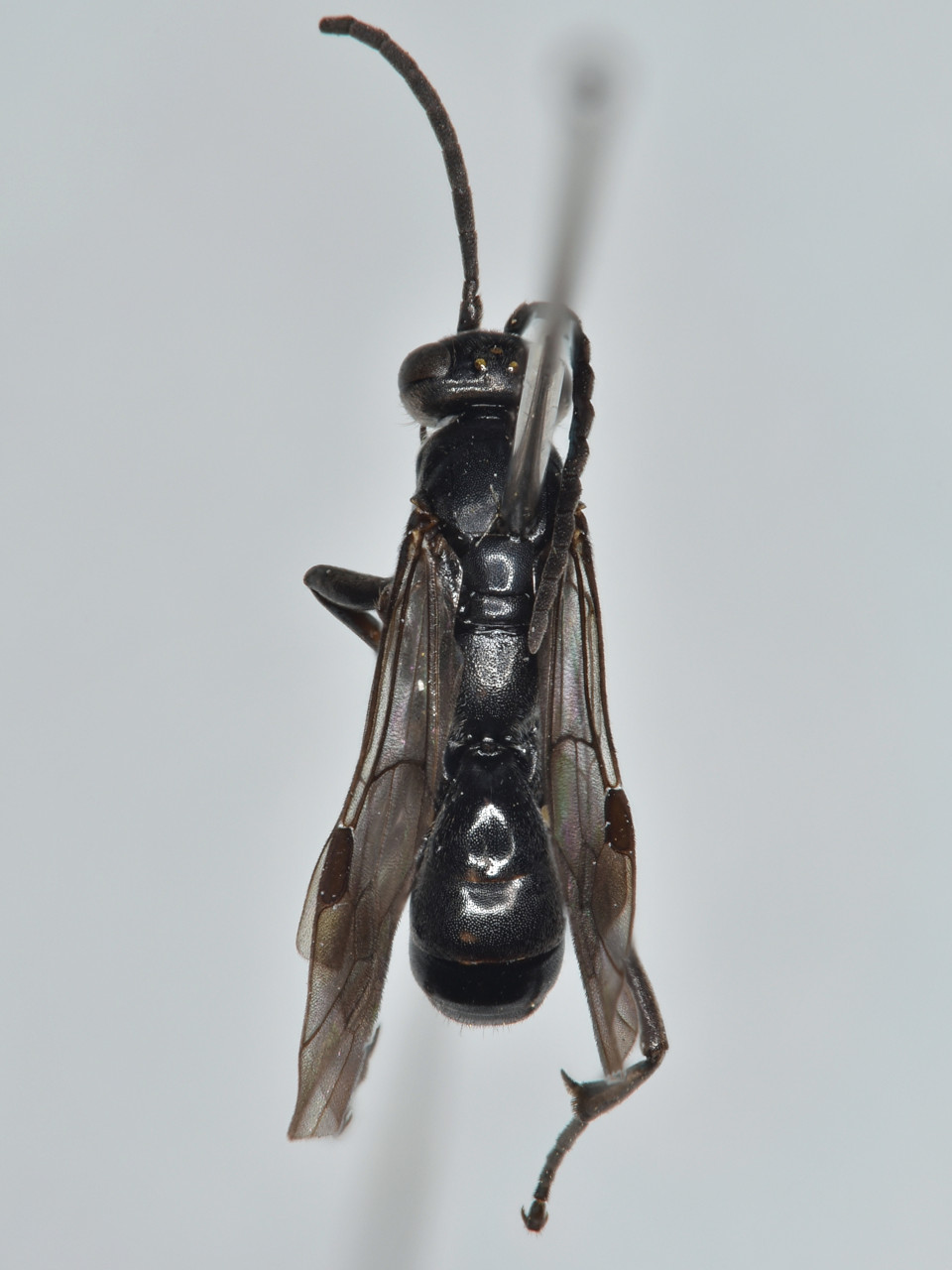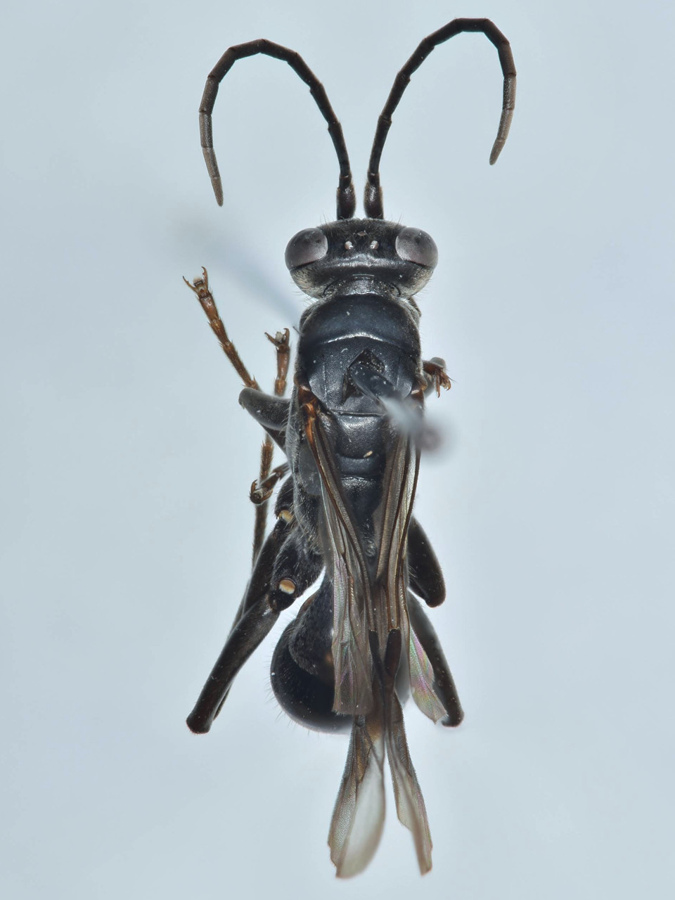 Dipogon romanokovae Lelej, 1986 Body black, white spots near forewing tips. Short hairs are sparsely present on the lower surface of the middle and hind femora.