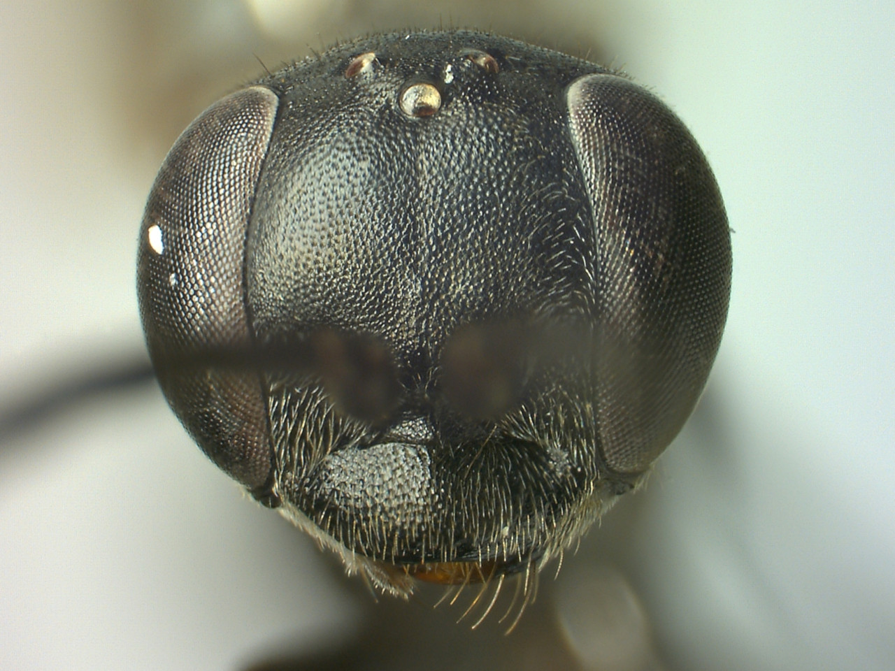 Body black, large white spots near the outer edge of the wings. Long grayish-white erect hairs are present on genae.