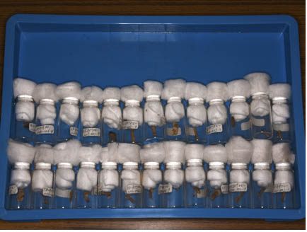びんごとに、どの竹筒から出たかを記録しておくと、どのハチがどんな巣を作るのかがわかります。