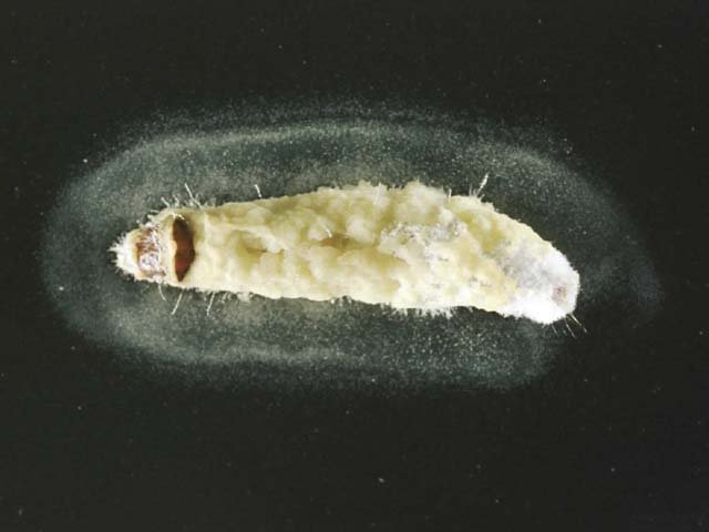 説明 昆虫疫病菌類の一種。亜属を独立の属としてZoophthora radicansと呼ぶこともある。かつてはEntomophthora spaerospermaと呼ばれていた。疫病菌類としては例外的に寄主範囲が広く、鱗翅目幼虫、半翅目、双翅目などに寄生する。死体上に分生子が形成されている場合は、灰色のビロード状に見える。死体内に休眠胞子が形成されている場合には、体は軟腐状になる。分生子は細長い楕円形ないし砲弾形、透明、大きさ、15 - 21× 5 - 8μm、縦横比2.2 - 3.3。核数1個。分生子が発芽して形成するキャピラリー型胞子は14 - 21 × 4 - 7μm、縦横比2.6 - 4。休眠胞子は球形で透明、直径20 - 38μm。世界的に分布する。培養も疫病菌には珍しく容易、ウンカ類の防除用にアメリカで製剤化されたこともある。 |
