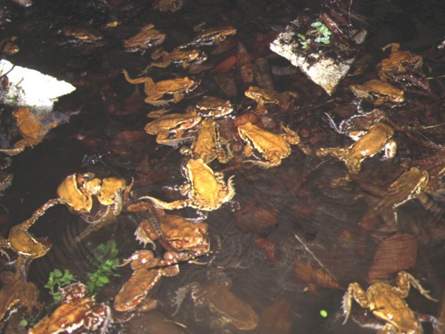 説明 主に近畿以東に分布するアズマヒキガエルB. j. formosus と、主に近畿以西に分布するニホンヒキガエル B. j. japonicus の二亜種にわけられる。両者の違いは鼓膜の大きさで、ニホンヒキガエルの方が小さい。移入種のウシガエルを除けば、本土では最大のカエル。ガマの名前で良く知られている。森林に棲み、地表性の昆虫、土壌動物などを捕食している。産卵は池などで行われる。両生類は産卵場所に魚がいるところは避けることが多いが、本種は魚がいてもよく繁殖する。幼生は真っ黒で集団で泳ぐことが多い。区別点:イボのあるツチガエルなどとの相違は、目の後ろ、鼓膜の上の耳腺がハッキリと膨らんでいること(ツチガエルでは弱い)鳴き声:クッ、クッ、クッというように子犬のようなくぐもった声で鳴く。 |