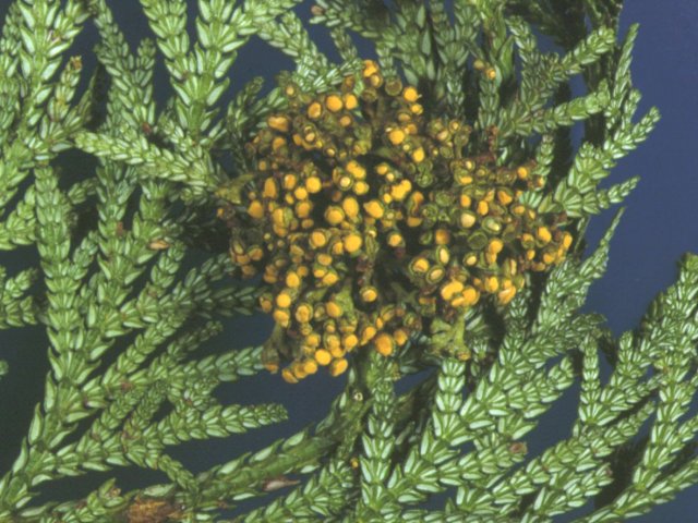 説明 葉や枝に緑色で釘の頭状の不定芽が形成され、これが分岐を繰り返して長年にわたり成長して大きなてんぐ巣状になる。枝の基部も紡錘形に肥大し、枝全体が枯れる場合もある。小さな患部は海藻のひじきにも似た様子になるので、“アスナロのひじき”とも呼ばれる。春に患部の不定芽から黄色の粉(さび胞子)が生じる。本菌は中間宿主をもち、さび胞子はカンバ類の葉に感染して夏胞子・冬胞子世代を形成するが、中間宿主を経ない生活環も証明されている。また、罹病した枝の挿し木によっても伝染する。ネズコ、ニオイヒバにも発生。この菌は日本のみに分布し、極めて特異な菌である。 |