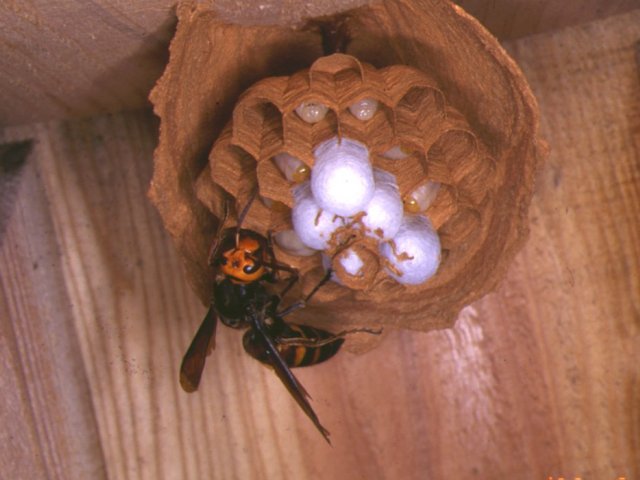 説明 女王の体長24~37mm。働きバチは平均的には女王より小さいが、しばしば中間的な大きさのものが見られ、外形だけの区別は困難なことが多い。日本産スズメバチ属の中では最も小規模な巣を作る。人に対する攻撃性も弱い。最大の特徴は、餌としてアシナガバチ属やホソアシナガバチ属の巣を、ほぼ専門的に襲うことである。本州以南のアシナガバチにとっては、本種は最大の天敵といえる。営巣開始は一般に6月以降、働きバチは7月下旬ころ羽化し、9月には営巣を終える。すなわち他のスズメバチより営巣開始が遅く、巣の解散は早い。これはアシナガバチの営巣期間に合わせるためと言われる。営巣規模は小さく、育室数は通常300以下。