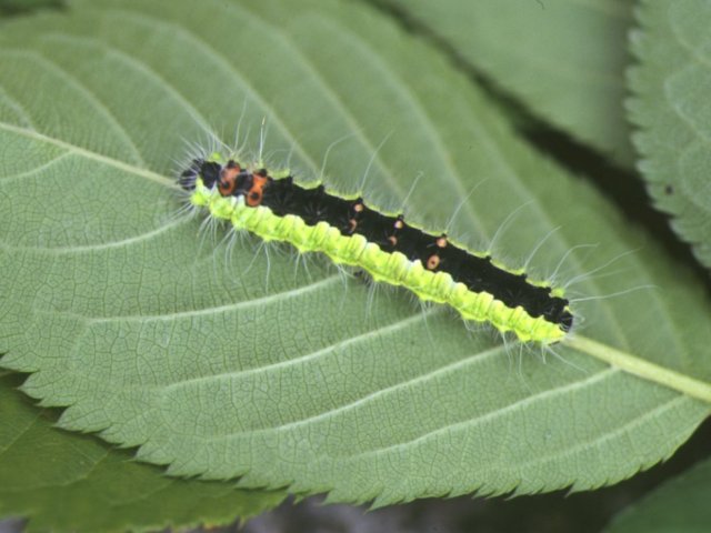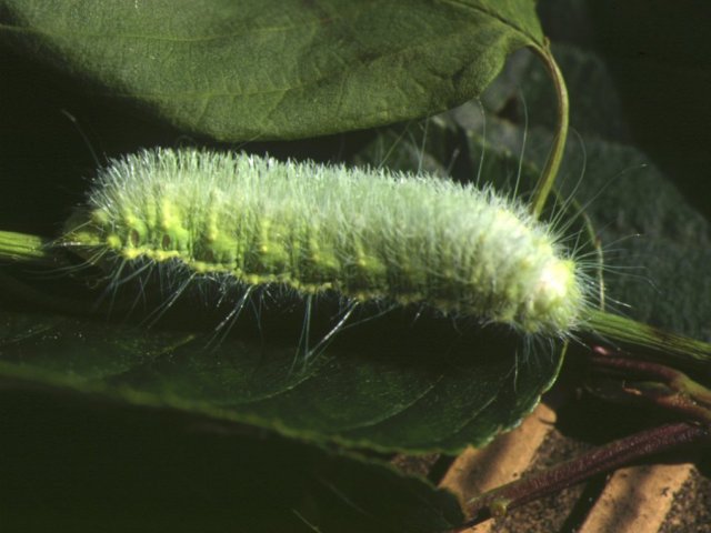 説明 前翅長は約41~52mm。1齢幼虫は体全体が黒色であるが、2~3齢幼虫は側面が黄緑色で背面が黒色、4齢以降は全体緑色で白色毛を伴う。5月下旬~6月上旬に終齢幼虫となる。終齢幼虫の体長は約60mm。だ円形で網目状の繭を作って蛹化する。成虫は秋に羽化し、交尾したメスは樹幹に不規則な卵塊を産みつける。卵で越冬する。幼虫は、バラ科、ブナ科、カエデ科などさまざまな植物につく。 |