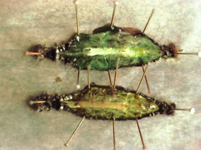 説明 このCPVに感染したマツカレハ幼虫は、はじめ食欲が減退し、体が縮小したり、最初液状便を、重症になると白色下痢便を排泄する。嘔吐し腹背部を隆起して静止する。脱肛する場合もある。真皮に病変が起きないので皮膚の色も変わらず破れやすくもならない。この病気の特徴は中腸の円柱細胞の細胞質に多角体が形成されることである。このため中腸は白変している。細胞質に形成された多角体は次第に成長して、その感染細胞は中腸組織から脱落したり、または破壊される。従って重症期の胃液には多角体が混入したり、便と共に排泄される。下痢には多角体が多く含まれるので白色に見える。このウイルスは激しい流行病を起こすものではないが、高密度時には高い死亡率をもたらし、親から子への伝搬も期待できる。このウイルスを製剤化したのがマツケミンという名で林業薬剤として登録されている。この剤はCPVを接種して飼育したマツカレハ幼虫を磨砕濾過して得られたCPV多角体にシリカ粉末と展着剤、乳化剤を加えたものである。この製剤は我が国で初めて登録になったウイルス製剤であるが、現在では製造されていない。 |