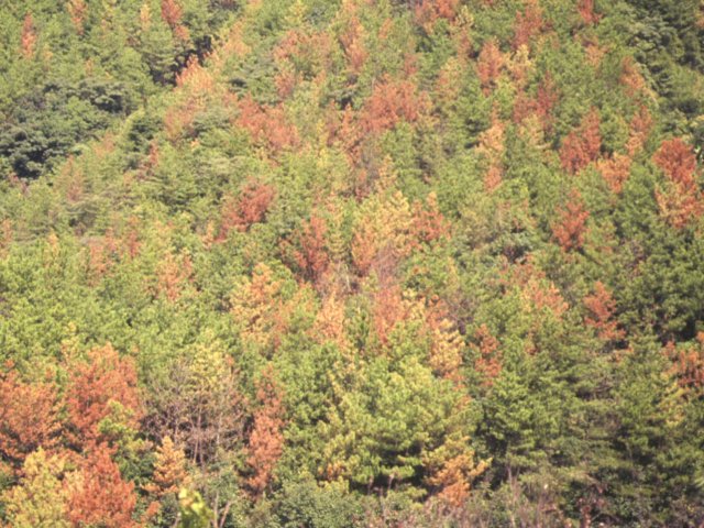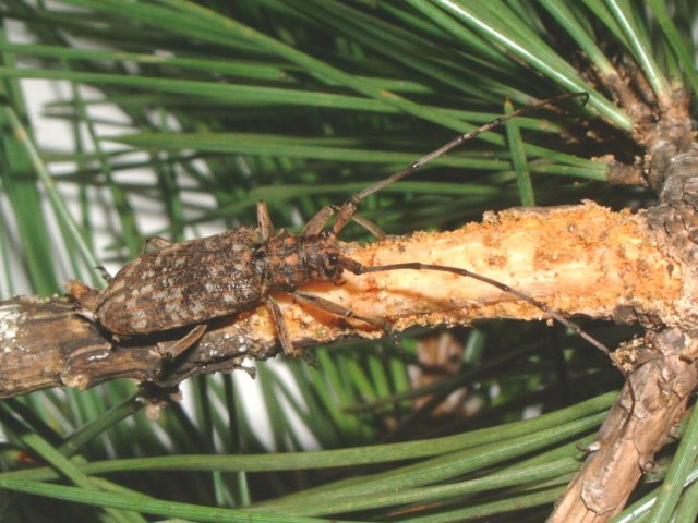 説明 成虫の体長18~28mm。マツ類の穿孔性害虫で、松枯れをもたらすマツノザイセンチュウ(北米から侵入)の媒介者として有名。マツからの成虫の脱出は関東では5月~7月。成虫は健全なマツの枝の樹皮を食べ、このとき体内に寄生していたマツノザイセンチュウがマツ樹体内に移行する。雌成虫は衰弱・枯損したマツの樹皮に噛み痕をつけて1個ずつ産卵する。生涯産卵数は平均約100個。幼虫は内樹皮を摂食したのち、材内に蛹室を作って蛹で越冬し、翌年羽化脱出する。防除は枯損木の焼却、薬剤散布などが主流だが、生物的防除法として捕食者や昆虫病原菌による方法も研究されている。 |