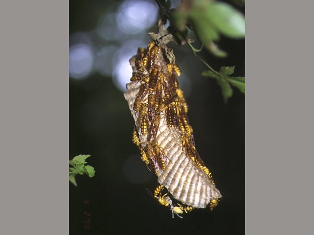 説明 体長は約15~20mm。体型が細長く、体色は黄色で淡褐色の斑紋がある。メスの頭楯部分には班紋がないのが和名の由来。近似種のヒメホソアシナガバチ(Parapolybia varia)のメスの頭楯には黒褐色の縦紋があるので区別できる。林内および林縁の低木や草本の葉裏や枝、茎などに営巣する。最盛期の働きバチ数は最大で約100匹である。コナラなどの樹洞で集団で越冬する。攻撃性はやや強く、植林地の下刈りで刺されることが多い。 |