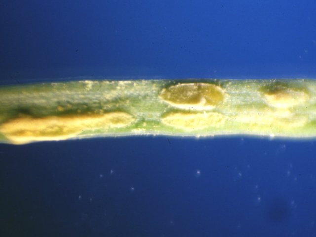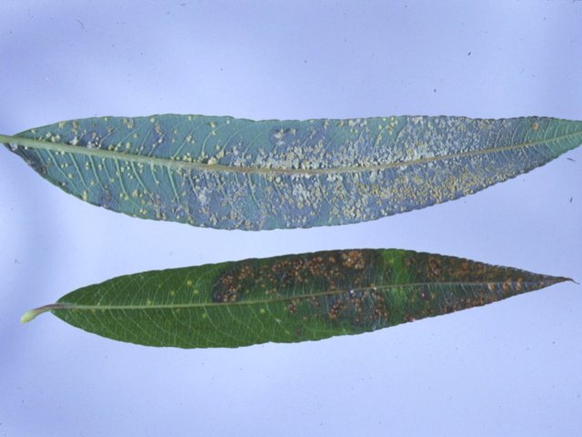 説明 病原菌は、他にMelampsora属菌13種、Caeoma属菌1種がある。5月頃から主に葉の裏側に黄色の粉(夏胞子)が形成され、夏胞子による感染が繰り返される。秋には葉の組織内に冬胞子が形成され、落葉中で越冬する。バイオマスエネルギーを得るために、海外ではヤナギの長短伐期栽培が行われているが、罹病葉は早期落葉を起こすため、被害が最も大きい病害となっている。越冬した冬胞子からは担子胞子が形成され、早春に中間宿主のカラマツなどへ感染を起こし、そこに形成されるさび胞子がヤナギへの第一次伝染源になる。病原菌の種によっては、ケシ科植物が中間宿主となるものもある。 |