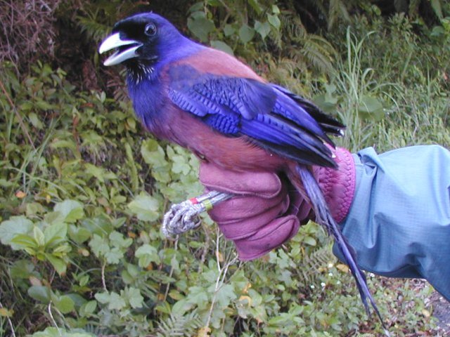 説明 日本固有種で、1921年に国の天然記念物に指定された。個体数が減少しているとして、現在、環境庁によるレッドデータリストでは、絶滅危惧II類になっている。雌雄同色であり、顔が黒色、頭頂から頸部、喉、翼、尾羽があざやかなルリ色で、背中から腰部、腹部はうすい栗色と美しい羽色を持っている。元来、常緑広葉樹林に生息、大木の樹洞、斜面のくぼみ等に営巣するが、ときどき人家の軒先にも巣を作る事例が報告されている。繁殖期は、本土の鳥に比してやや早く、1月~3月が最盛期である。1巣4~5卵。つがいばかりでなく、一部の若鳥もヘルパーとして繁殖に協力する婚姻形態をとるといわれている。生息個体数は1,000~5,000羽程度といわれているが、正確な調査結果はほとんどない。近縁種は台湾から中国本土、屋久島以北から日本列島全域を経て広くヨーロッパまで分布するカケス(G. glandarius)よりもヒマラヤ地域に限局して分布するインドカケス(G. lanceolatus)に近いという結果がミトコンドリアDNAによる系統解析結果から得られている。 また、本種の特異的な分布様式から、個体群内での遺伝的多様性の減少が危惧されている。 |