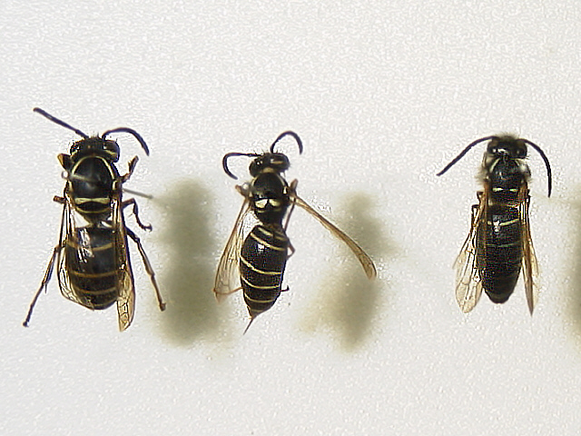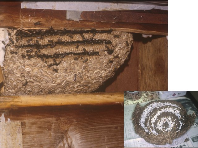 説明 女王の体長15-16mm、働きバチ10-12mm(写真上)。「ジバチ」と俗称されるもののひとつで、その幼虫や蛹は長野県などでは「蜂の子」として珍重される。味はスズメバチ類中、随一である。土中や人家壁間に営巣する(写真下)。日本産のスズメバチ類の中で最大の営巣規模を有し、育室数は10000を越えることもある。さまざまな昆虫やクモ類を狩り、哺乳類の死体などにも飛来するなど、餌の範囲は非常に広い。 |