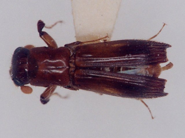 説明 各種の広葉樹に穿孔する。成虫の体長は雄で約5.9mm、雌で約6.3mm。円筒形、光沢ある赤褐色で上翅先端は黒。1年1世代である。成虫は5~10月に出現する。伐採直後の大径丸太(20cm以上)に寄生する。一夫一妻性である。最初に材の中心部に向い孔道を掘り、年輪に沿って分岐する。雌成虫は孔内で長期間にわたり産卵を行うことから、材内には様々な齢期のものが見られる。孵化幼虫は孔道から上下に孔を堀り、その中で蛹化する。穿入孔から細繊維状のフラスを排泄する。坑道の周辺はアンブロシア菌で黒変するが、その外方の材は白くなる。ブナ丸太の重要穿孔虫になっている。 |