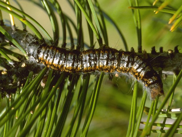 説明 アカマツ・クロマツなど全てのマツ属と、カラマツ・ヒマラヤスギを加害する。被害面積は、1975年までは数万haにおよんでいたが、近年は減少しているが、マツ材線虫病の防除の影響とみられる。成虫は雌で開張85mm内外、雄65mm内外であるが、色彩とともに個体差が大きい。卵は長さが2mm程度の長楕円形で淡赤褐色から青白色をしている。幼虫は脱皮が進むと黄褐色から黒褐色となり、個体差が大きくなる。全体に剛毛を生じ、胸部第2、3節背面の黒藍色の刺毛が目立つ。体長は大きいものでは90mmになる。繭は灰色から灰褐色で幼虫の刺毛がついている。普通年1回の発生である。茨城、京都、兵庫、高知、熊本、福岡、鹿児島などでは年2回発生する地域もある。年に2回発生する地域では複雑に生態となっている。年1回発生する生活史の場合、7月から8月に成虫が発生し、幼虫で越冬し、翌年の7月に蛹になり、成虫となるという経過を示す。この場合、春先の被害が大きくなる。産卵は針葉に卵塊状に産まれる。1卵塊の卵数は100~300個である。雌1頭の産卵数は200~600個である。孵化した幼虫は周囲の針葉の片側だけを食害することから、針葉が赤変する。早期発見の目安となる。幼虫はマツケムシと呼ばれる。この時期の幼虫は口から糸をはいて落下し移動する。2齢以降の幼虫は針葉を完全に食べる。繭は樹上や下草に作られる。被害が激しい場合枯損にいたることがある。食害量が多ければ枯損しない場合にも成長に影響をあたえる。本種の天敵についてはよく調べられており、補食性の鳥類、寄生性昆虫21種、微生物等がある。 |