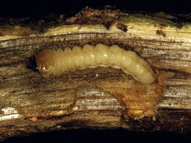 説明 成虫は体長20~36mm、成熟幼虫は約50mm。幼虫がセンノキ、タラノキ等の生立木や衰弱木を食害する。1年1回の発生で成虫は6~8月に出現し、樹皮や葉柄などを後食する。老熟幼虫で越冬し、翌年の春に蛹化・羽化脱出する。幼齢木では食害部から折損することがあり、材の劣化につながる。また、樹皮下の食害で枯損する場合もある。農作物の栽培ウドの茎内を食害して枯死させた事例がある。 |