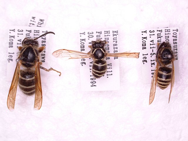 女王の体長16ー18mm、働きバチ11-14mm(写真上)。形態はニッポンホオナガスズメバチに酷似するが、ほおの長さ(複眼下端と大顎上端との距離)がより長く、頭盾の黒班が下端で大きくくびれないなどの点で異なる。日本ではおもに山地に生息するが、生活史の情報は非常に少ない。