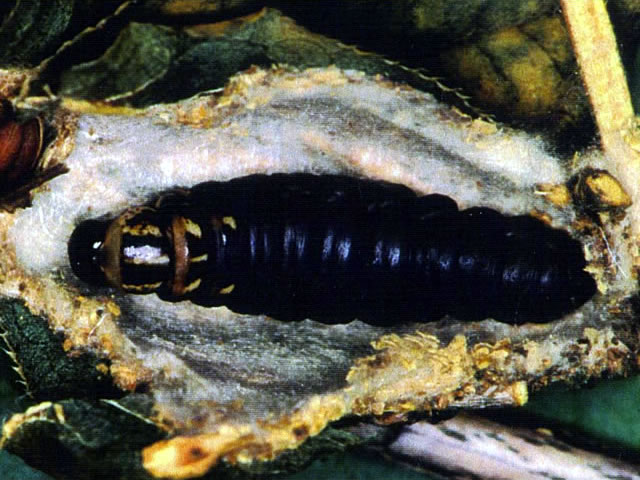 説明 終齢幼虫は体長35~50mm、長さ50mmほどの大きな蓑を作って中に生息。成虫は雄は開長30~42mmの褐色の蛾だが、雌は体長は30mmほどの脚と翅のない蛆状で蓑の中から出ないまま交尾、産卵する。食樹は雑食性で柑橘、チャ、サクラなど各種の樹木を加害。年1化で、成虫は5月下旬~8月に羽化、幼虫は6月以降に出現し蓑の中で越冬、4~6月に蓑内で蛹化。防除は捕殺の他、MEP、合成ピレスロイド剤などが有効だが、近年、南アジア原産のオオミノガヤドリバエ(Nealsomyai rufella)が侵入して急激に増殖し、西日本では絶滅に近いほど激減しているところもある。 |