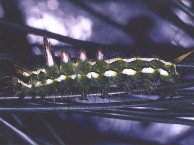 説明 成虫は開長、雄42~46mm、雌44~65mmで灰褐色に細かな黒い斑紋をもつ蛾。終齢幼虫は、体長40~45mm、鮮緑色または黄緑色に太い白線、背面の瘤から赤褐色の毛束が生じる。通常年2化で、成虫は5~6月と8~9月に発生。越冬は葉上の薄い繭内で幼虫のまま行う。食樹はスギ、ヒノキ、ヒマラヤシーダー、イブキなど。新葉より旧葉を好み、樹冠内部の被害が多い。被害程度が大きい場合は枯死する。 |