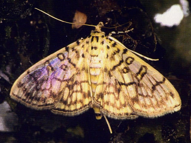成虫の開翅長25-30mm、翅は黄色で全体に波状の模様。幼虫25mm、頭は黒褐色、胴部は緑色。フヨウ、ムクゲ等。アオギリを加害するのはオオワタノメイガという別種になった。葉を筒状に巻く。年数回、成虫は5-8月発生、孵化幼虫は初め葉裏、成長すると葉をまく、幼虫越冬。