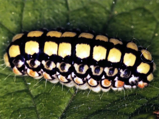 成虫は黒色で、前翅に斜めの白帯がある。後翅は周囲を除いて白色。翅を広げた大きさは約60mm、幼虫は約25mm、ナマコ型。全体黒色で、各体節背面の両側にそれぞれ1個の黄白色紋・赤色の隆起が並ぶ。サワフタギの葉を食べる。幼虫の体液でかぶれることもある。