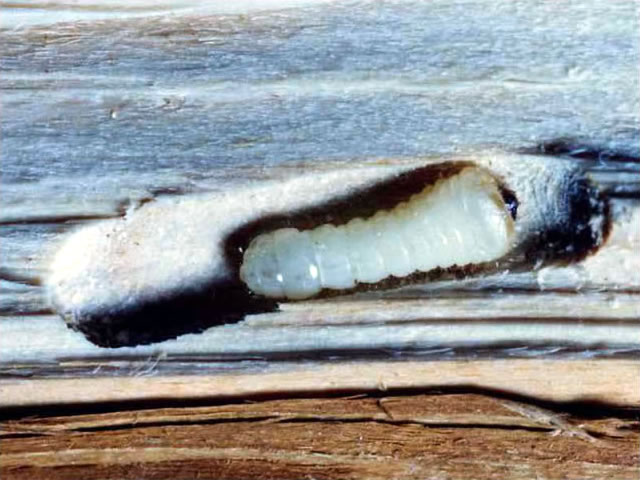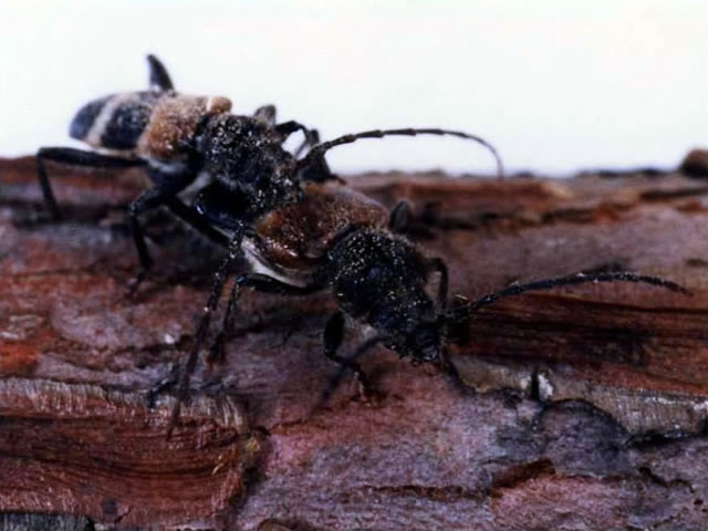 説明 成虫は体長7~18mm。成虫は3~5月にかけて出現し、ヒノキ科の伐採木上で活動する。分布は局所的であり、採集記録が限られている。上翅の色彩には変異があり、この写真の成虫は2本の黄白色の横帯を持つが、このような紋が無く一面が黒化している個体もいる。ヒノキ、アスナロ、ヒバ、コノテガシワ、イブキ、スギが食樹であり、特にヒノキ科の針葉樹を好む。 |