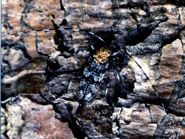 説明 成虫の体長9~14mm。成虫は6月から8月にかけて出現して、マツ類の衰弱木や伐倒木に集まり、産卵する。孵化した幼虫は樹皮や樹皮下を摂食する。材入して蛹室を作るものもいるが、樹皮下に作るものが多い。マツ枯れの病原体であるマツノザイセンチュウは、本種の蛹室にはほとんど集まらないため、本種はマツノザイセンチュウを媒介しない。従来、日本産は2亜種(北海道に分布するヒゲナガモモブトカミキリと本州以南に分布するホンドヒゲナガモモブトカミキリ)に分けられていたが、1996年に統一された。 |