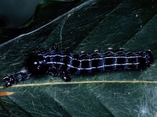 成長は開張約45mm。老熟幼虫は体長約40mmで、頭部は赤褐色、胴部は紫灰色で各節に黒い模様と細い白色の縦条がある。サクラ、リンゴ、ナラなどを食害する。年1化で、土中で蛹で越冬し、暖地では成虫は3~4月に羽化する。幼虫は葉を縦に巻き、この中で食害を続ける。