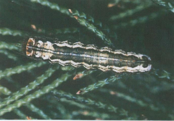 成虫は開張22~35mm。翅は暗灰色で、前翅に薄い斑紋。幼虫は体長30mm前後、頭部は黄褐色、胸部も同色で背部と側面に灰白色の帯がある。ヒノキ、カイヅカイブキ、ハイビャクシンなどの針葉樹を食害する。年に2回、6~7月と9~10月に成虫が発生、夜間に枝葉に産卵する。越冬は卵または幼虫。